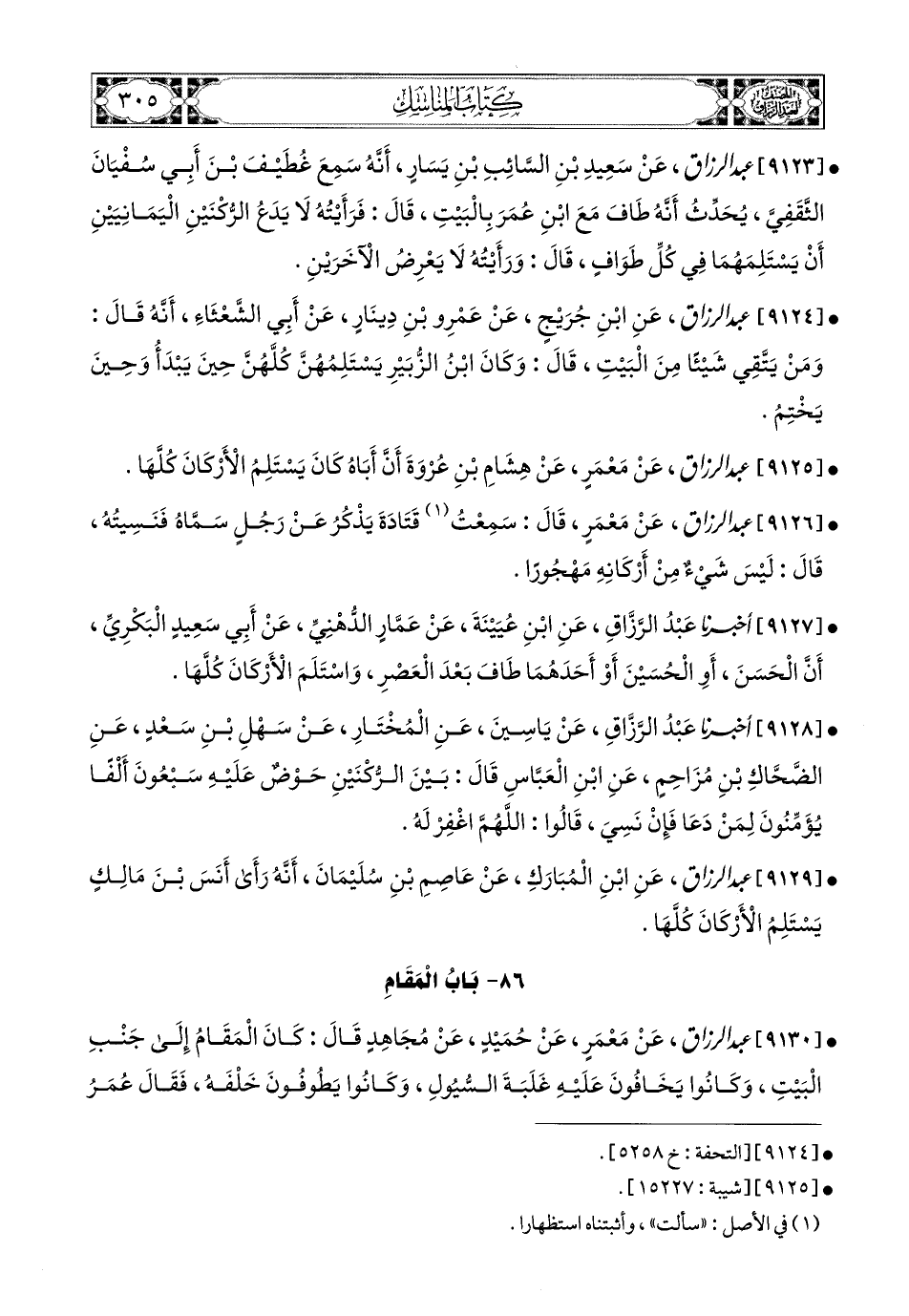 9125- عبد الرزاق، عَنْ مَعْمَرٍ، عَن هِشَامِ بْنِ عُرْوَةَ؛ أَنَّ أَبَاهُ كَانَ يَسْتَلِمُ الأَرْكَانَ كُلَّهَا.