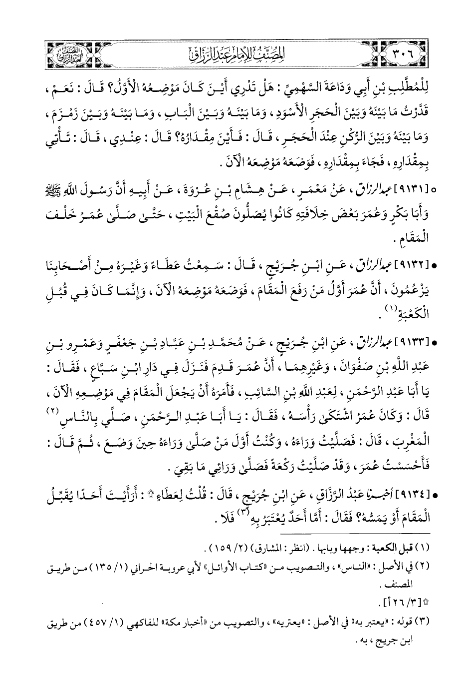 9131- عبد الرزاق، عَنْ مَعْمَرٍ، عَن هِشَامِ بْنِ عُرْوَةَ، عَنْ أَبِيهِ؛ أَنَّ رَسُولَ اللهِ صَلَّى اللهُ عَلَيْهِ وَسَلَّمَ، وَأَبَا بَكْرٍ، وَعُمَرَ بَعْضَ خِلاَفَتِهِ كَانُوا يُصَلُّونَ صُقْعَ الْبَيْتِ، حَتَّى صَلَّى عُمَرُ خَلْفَ المَقَامِ.