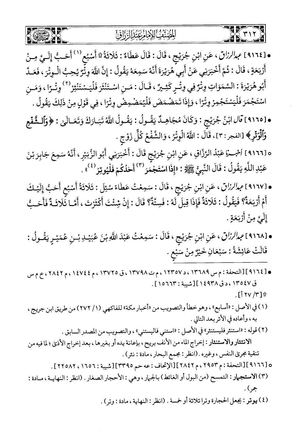 9164- عبد الرزاق، عَنِ ابْنِ جُرَيْجٍ، قَالَ: قَالَ عَطَاءٌ: ثَلاَثَةُ أَسْبُعٍ أَحَبُّ إِلَيَّ مِنْ أَرْبَعَةٍ، قَالَ: ثُمَّ أَخْبَرَنِي عَنْ أَبِي هُرَيرَةَ، أَنَّهُ سَمِعَهُ يَقُولُ: إِنَّ اللهَ وِتْرٌ يُحِبُّ الْوِتْرَ، فَعَدَّ أَبو هُرَيرَةَ: السَّمَاوَاتِ وِتْرٌ، فِي وِتْرٍ كَثِيرٍ، قَالَ: مَنِ اسْتَنْثَرَ فَلْيَسْتَنْثِرْ وِتْرًا، وَمَنِ اسْتَجْمَرَ فَلْيَسْتَجْمِرْ وِتْرًا، وَإِذَا تَمَضْمَضَ فَلْيُمَضْمِضْ وِتْرًا، فِي قَوْلٍ مِنْ ذَلِكَ يَقُولُ.