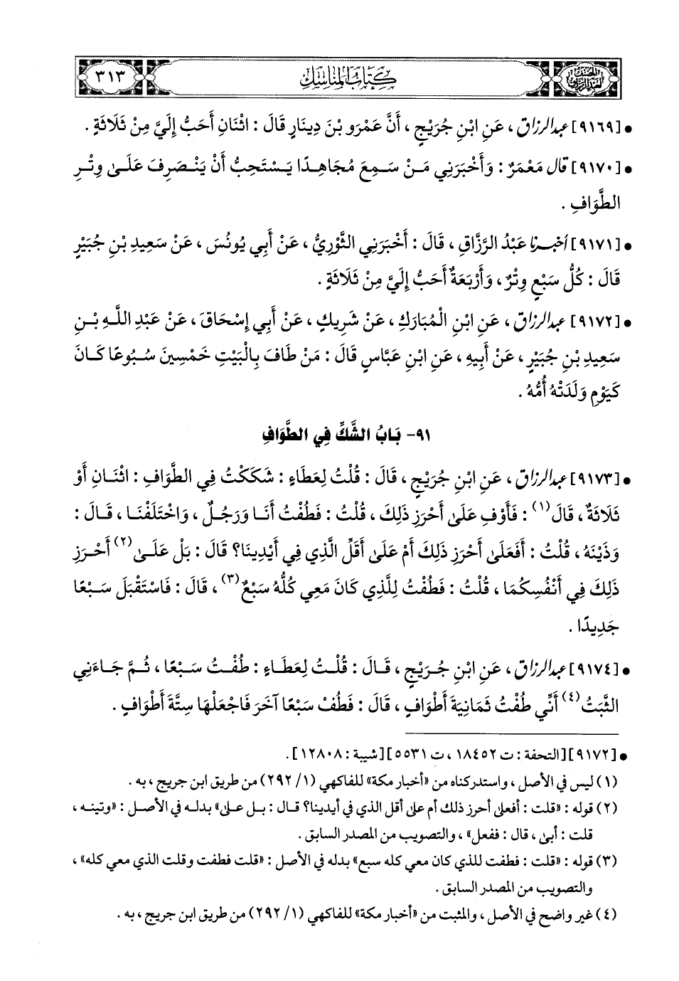 9172- عبد الرزاق، عَنِ ابْنِ المُبَارَكِ، عَن شَرِيكٍ، عَنْ أَبِي إِسْحَاقَ، عَنْ عَبدِ اللهِ بْنِ سَعيدِ بْنِ جُبَيرٍ، عَنْ أَبِيهِ، عَنِ ابْنِ عَبَّاسٍ، قَالَ: مَنْ طَافَ بِالْبَيْتِ خَمْسِينَ سُبُوعًا، كَانَ كَيَوْمِ وَلَدَتْهُ أُمُّهُ.
