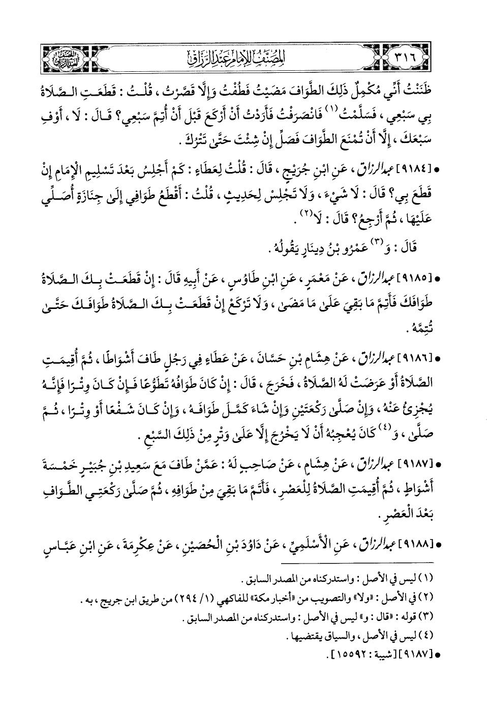 9188- عبد الرزاق، عَنِ الأَسْلَمِيِّ، عَن دَاوُدَ بْنِ الْحُصَيْنِ، عَنْ عِكْرِمَةَ، عَنِ ابْنِ عَبَّاسٍ، قَالَ: مَنْ طَافَ بِالْبَيْتِ فَبَدَتْ لَهُ حَاجَةٌ، فَلْيَنْصَرِفْ عَلَى وَتْرٍ، وَلْيَرْكَعْ رَكْعَتَيْنِ، وَلاَ يَعُدْ لِبَقِيَّةِ سَبْعَيْهِ.