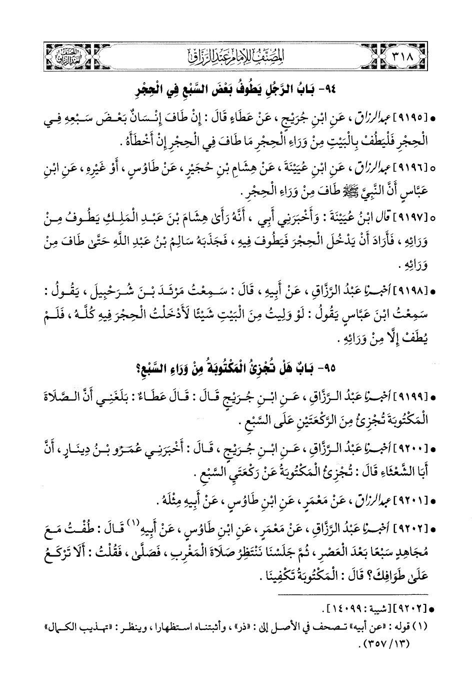 9196- عبد الرزاق، عَنِ ابْنِ عُيَيْنَةَ، عَن هِشَامِ بْنِ حُجَيْرٍ، عَن طَاوُوسٍ، أَوْ غَيْرِهِ، عَنِ ابْنِ عَبَّاسٍ؛ أَنَّ النَّبِيَّ صَلَّى اللهُ عَلَيْهِ وَسَلَّمَ طَافَ مِنْ وَرَاءِ الْحِجْرِ.