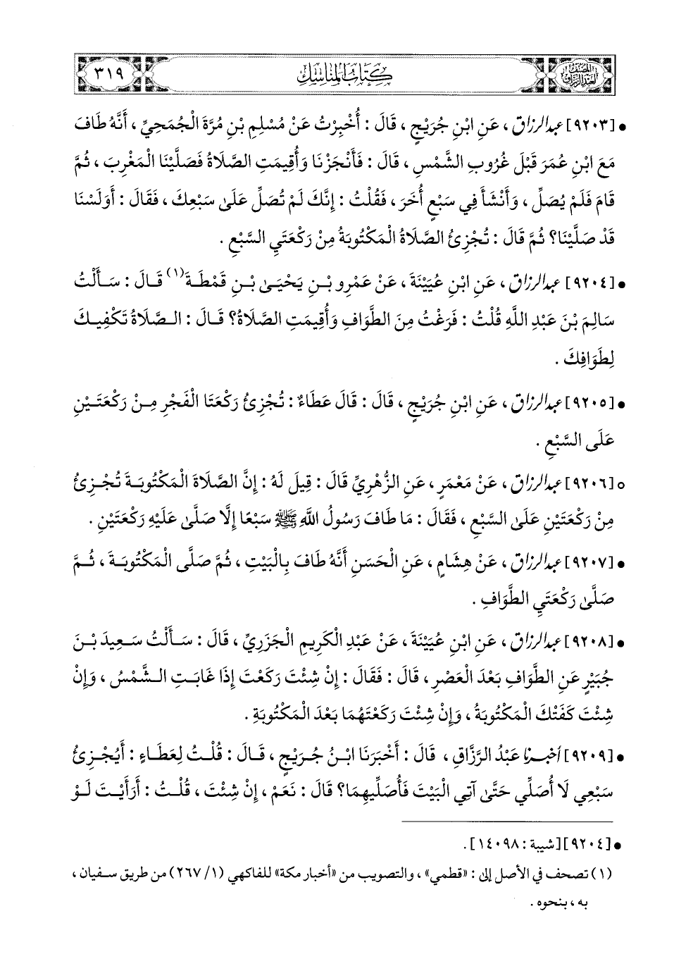 9206- عبد الرزاق، عَنْ مَعْمَرٍ، عَنِ الزُّهْرِيِّ، قَالَ: قِيلَ لَهُ: إنَّ الصَّلاَةَ المَكْتُوبَةَ تُجْزِئُ مِنْ رَكْعَتَيْنِ عَلَى السَّبْعِ، فَقَالَ: مَا طَافَ رَسُولُ اللهِ صَلَّى اللهُ عَلَيْهِ وَسَلَّمَ سَبْعًا إِلاَّ صَلَّى عَلَيْهِ رَكْعَتَيْنِ.