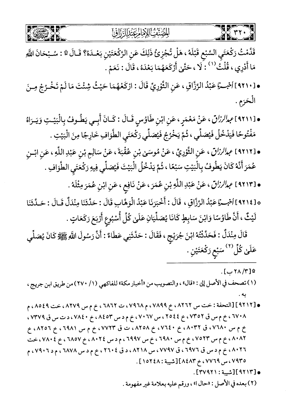 9212- عبد الرزاق، عَنِ الثَّورِيِّ، عَن مُوسَى بنِ عُقْبَةَ، عَن سَالِمِ بْنِ عَبدِ اللهِ، عَنِ ابْنِ عُمَرَ؛ أَنَّهُ كَانَ يَطُوفُ بِالْبَيْتِ سَبْعًا، ثُمَّ يَدْخُلَ الْبَيْتَ فَيُصَلِّي فِيهِ رَكْعَتَيِ الطَّوَافِ.