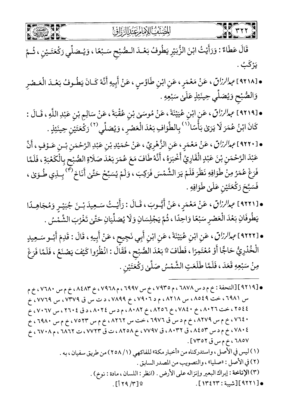 9218- عبد الرزاق، عَنْ مَعْمَرٍ، عَنِ ابْنِ طَاوُوسٍ، عَنْ أَبِيهِ؛ أَنَّهُ كَانَ يَطُوفُ بَعْدَ الْعَصْرِ وَالصُّبْحِ، وَيُصَلِّي حِينَئِذٍ عَلَى سَبْعِهِ.