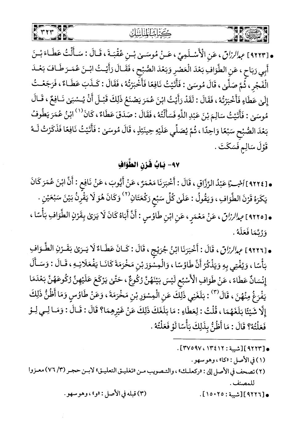 9226 - عبد الرزاق، قَالَ: أَخْبَرَنَا ابْنُ جُرَيْجٍ، قَالَ: كَانَ عَطَاءٌ لاَ يَرَى بَقَرْنِ الطَّوَافِ بَأْسًا، وَيُفْتِي بِهِ، وَيَذْكُرُ أَنَّ طَاوُوسًا، وَالمِسْوَرَ بْنِ مَخْرَمَةَ كَانَا يَفْعَلاَنِهِ، قَالَ: وَسَأَلَ إِنْسَانٌ عَطَاءً عَن طَوَافِ الأَسْبُعِ لَيْسَ بَيْنَهُنَّ رُكُوعٌ حَتَّى يَرْكَعَ عَلَيْهِنَّ رُكُوعَهُنَّ بَعْدَ مَا يَفْرَغُ مِنْهُنَ، قَالَ: بَلَغَنِي (1) ذَلِكَ عَنِ المِسْوَرِ بْنِ مَخْرَمَةَ، وَعَنْ طَاوُوسٍ، وَمَا أَظُنُّ ذَلِكَ إِلاَّ شَيْئًا بَلَغَهُمَا، قُلْتُ لِعَطَاءٍ: مَا بَلَغَكَ ذَلِكَ عَن غَيْرِهِمَا؟ قَالَ: قَالَ: وَمَالِي لَوْ فَعَلْتُهُ؟ قَالَ: مَا أَظُنُّ بِذَلِكَ بَأْسًا لَوْ فَعَلْتَهُ.