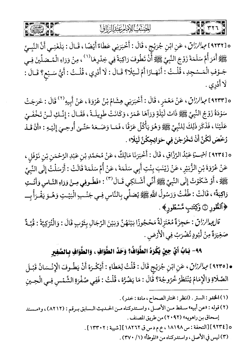 9232- عبد الرزاق، عَنِ ابْنِ جُرَيْجٍ، قَالَ: أَخْبَرَنِي عَطَاءٌ أَيْضًا، قَالَ: بَلَغَنِي أَنَّ النَّبِيَّ صَلَّى اللهُ عَلَيْهِ وَسَلَّمَ أَمَرَ أُمَّ سَلَمَةَ زَوْجِ النَّبِيِّ صَلَّى اللهُ عَلَيْهِ وَسَلَّمَ أَنْ تَطُوفَ رَاكِبَةً فِي خِدْرِهَا، مِنْ وَرَاءِ المُصَلِّينَ فِي جَوْفِ المَسْجِدِ، قُلْتُ: أَنَهَارًا أَمْ لَيْلاً؟ قَالَ: لاَ أَدْرِي، قُلْتُ: أَيُّ سَبْعٍ؟ قَالَ: لاَ أَدْرِي.