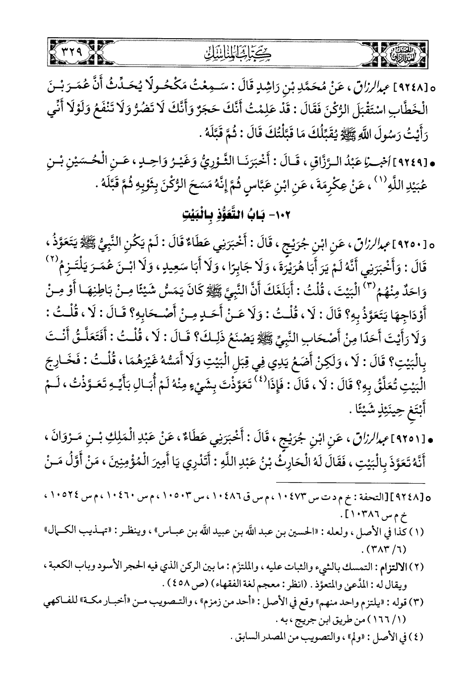 9250- عبد الرزاق، عَنِ ابْنِ جُرَيْجٍ، قَالَ: أَخْبَرَنِي عَطَاءٌ، قَالَ: لَمْ يَكُنِ النَّبِيُّ صَلَّى اللهُ عَلَيْهِ وَسَلَّمَ يَتَعَوَّذُ، قَالَ: وَأَخْبَرَنِي أَنَّهُ لَمْ يَرَ أَبَا هُرَيرَةَ، وَلاَ جَابِرًا، وَلاَ أَبَا سَعيدٍ، وَلاَ ابْنَ عُمَرَ يَلْتَزِمُ وَاحِدٌ مِنْهُمُ الْبَيْتَ، قُلْتُ: أَبَلَغَكَ أَنَّ النَّبِيَّ صَلَّى اللهُ عَلَيْهِ وَسَلَّمَ كَانَ يَمَسُّ شَيْئًا مِنْ بَاطِنِهَا، أَوْ مِنْ أَوْدَاجِهَا، يَتَعَوَّذُ بِهِ؟ قَالَ: لاَ، قُلْتُ: وَلاَ عَنْ أَحَدٍ مِنْ أَصْحَابِهِ؟ قَالَ: لاَ، قُلْتُ: وَلاَ رَأَيْتَ أَحَدًا مِنْ أَصْحَابِ النَّبِيِّ صَلَّى اللهُ عَلَيْهِ وَسَلَّمَ يَصْنَعُ ذَلِكَ؟ قَالَ: لاَ، قُلْتُ: أَفَتَعَلَّقُ أَنْتَ بِالْبَيْتِ؟ قَالَ: لاَ، وَلَكِنْ أَضَعُ يَدِي فِي قِبَلِ الْبَيْتِ، وَلاَ أَمَسُّهُ غَيْرَهما (1)، قُلْتُ: فَخَارِجَ الْبَيْتِ تُعَلَّقُ بِهِ؟ قَالَ: لاَ، قَالَ: فَإِذَا تَعَوَّذْتَ بِشَيْءٍ مِنْهُ لَمْ أُبَالِ بَأَيِّهِ تَعَوَّذْتَ، لَمْ أَبْتَغِ حِينَئِذٍ شَيْئًا.