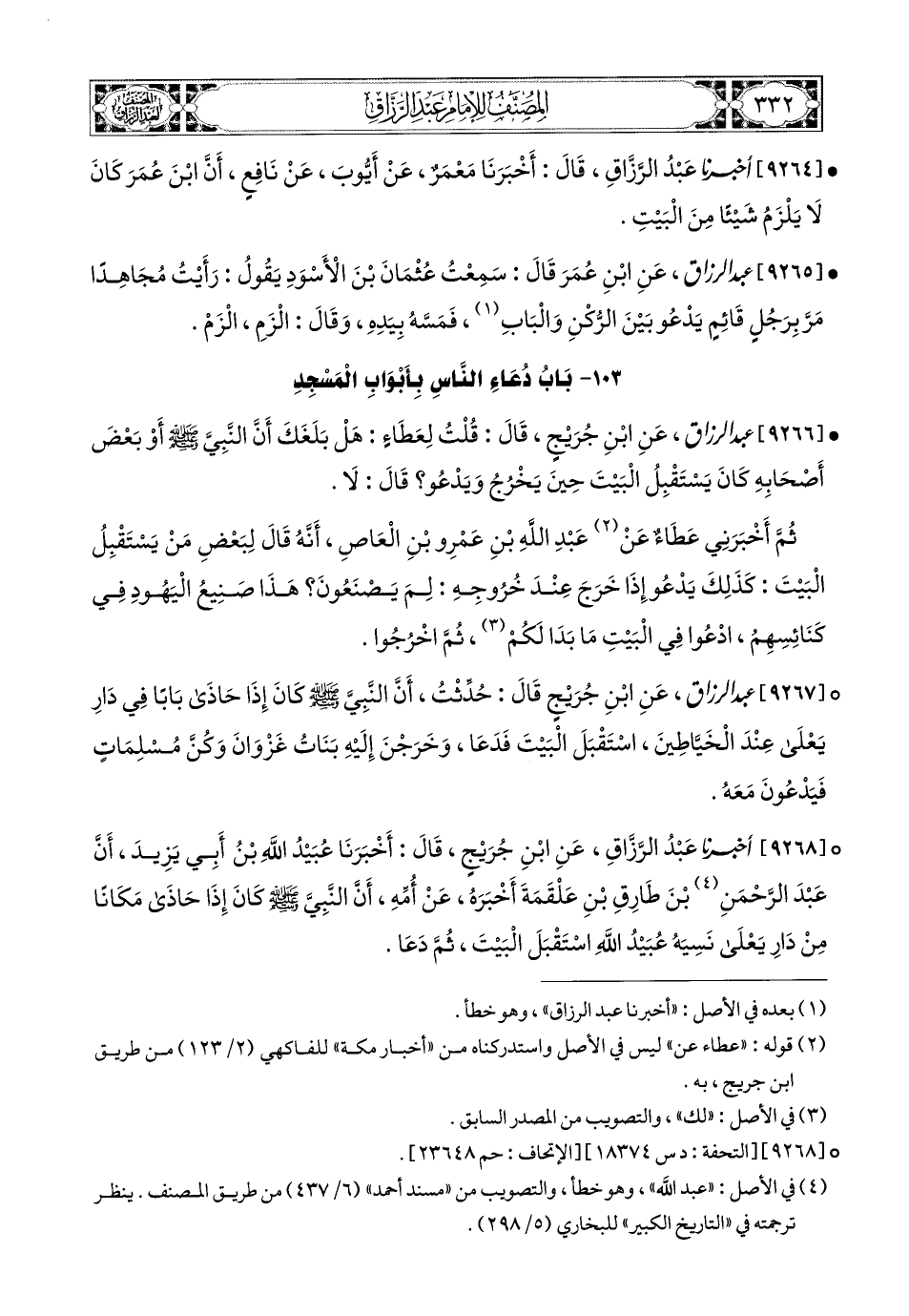9268- أخبرنا عبد الرزاق، عَنِ ابْنِ جُرَيْجٍ، قَالَ: أَخْبَرَنَا عُبَيْدُ اللهِ بن أَبِي يَزِيدَ، أَنَّ عَبدَ الرَّحْمَنِ بن طَارِقِ بْنِ عَلْقَمَةَ أَخْبَرَهُ، عَن أُمِّهِ؛ أَنَّ النَّبِيَّ صَلَّى اللهُ عَلَيْهِ وَسَلَّمَ كَانَ إِذَا حَاذَى مَكَانًا مِنْ دَارِ يَعْلَى، نَسِيَهُ عُبَيْدُ اللهِ، اسْتَقْبَلَ الْبَيْتَ، ثُمَّ دَعَا، قَالَ ابْنُ جُرَيْجٍ: وَكُنْتُ أَنَا أَطُوفُ وَعَبْدُ اللهِ بْنِ كَثِيرٍ الدَّارِيُّ، حَتَّى إِذَا جِئْنَا ذَلِكَ المَكَانَ اسْتَقْبَلَ الْبَيْتَ، ثُمَّ دَعَا، وَقَالَ: قَدْ بَلَغَنِي فِي هَذَا المَكَانِ شَيْءٌ.