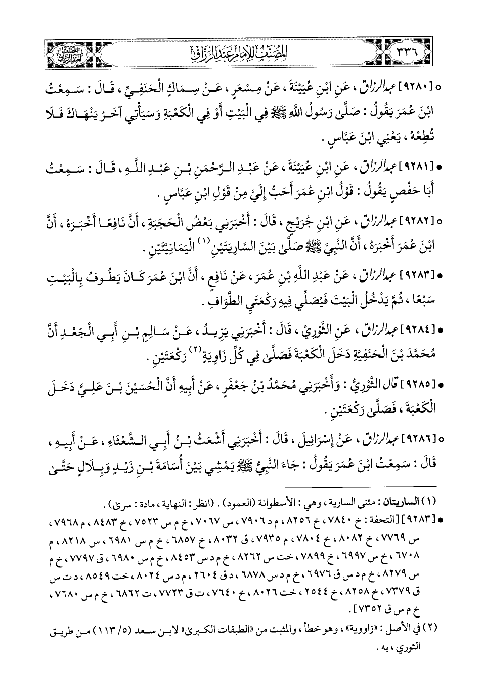 9282- عبد الرزاق، عَنِ ابْنِ جُرَيْجٍ، قَالَ: أَخْبَرَنِي بَعْضُ الْحَجَبَةِ، أَنَّ نَافِعًا أَخْبَرَهُ، أَنَّ ابْنَ عُمَرَ أَخْبَرَهُ، أَنَّ النَّبِيَّ صَلَّى اللهُ عَلَيْهِ وَسَلَّمَ صَلَّى بَيْنَ السَّارِيَتَيْنِ الْيَمَانِيَّتَيْنِ.