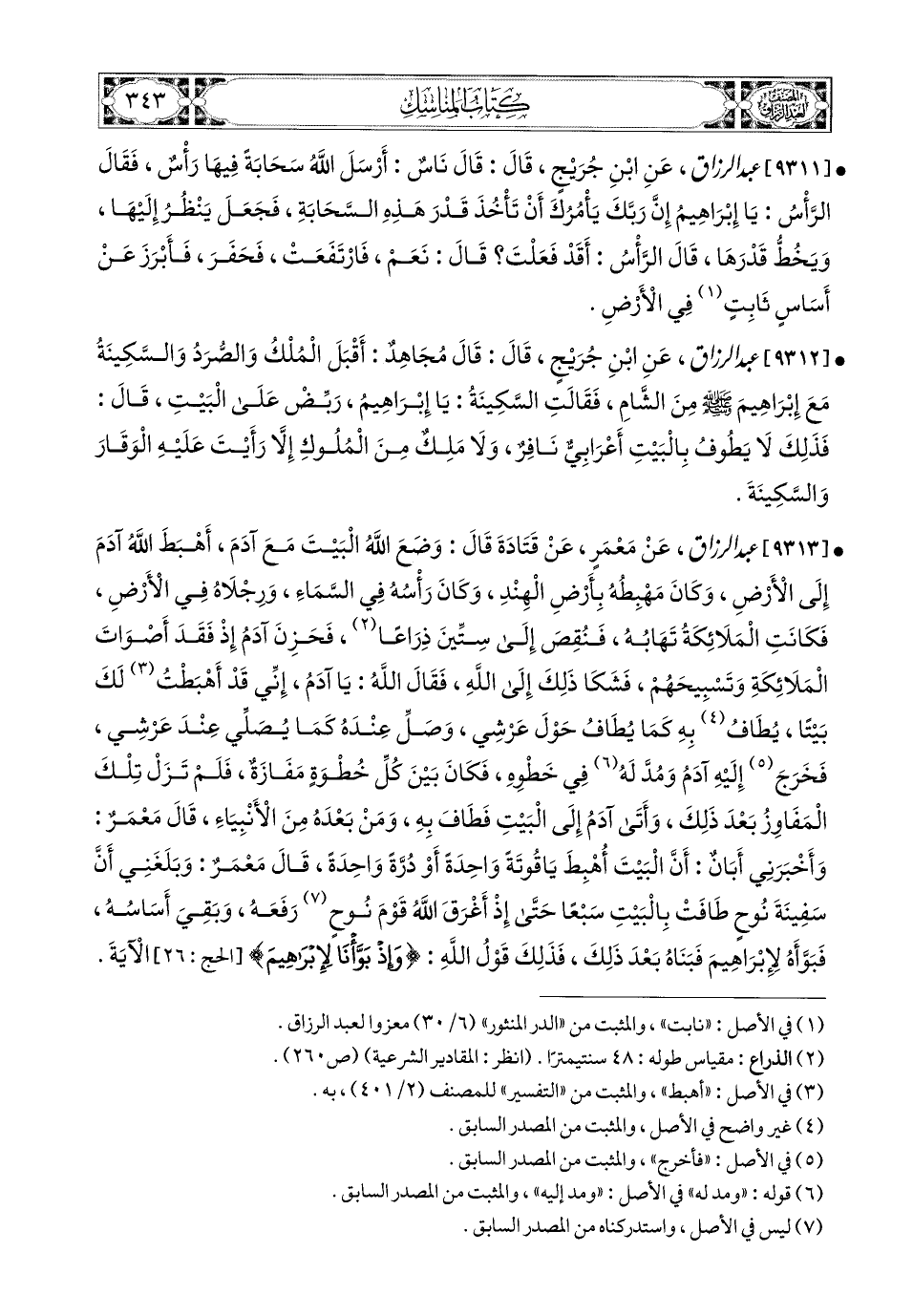9311- عبد الرزاق، عَنِ ابْنِ جُرَيْجٍ، قَالَ: قَالَ نَاسٌ: أَرْسَلَ اللهُ سَحَابَةً فِيهَا رَأْسٌ، فَقَالَ الرَّأْسُ: يَا إِبرَاهِيمَ، إِنَّ رَبَّكَ يَأْمُرُكَ أَنْ تَأْخُذَ قَدْرَ هَذِهِ السَّحَابَةِ، فَجَعَلَ يَنْظُرُ إِلَيْهَا، وَيَخُطَّ قَدْرَهَا، قَالَ الرَّأْسُ: أَقَدْ فَعَلْتَ؟ قَالَ: نَعَمْ، فَارْتَفَعَتْ، فَحَفَرَ، فَأَبَرَزَ عَنْ أَسَاسٍ ثَابِتٍ فِي الأَرْضِ.