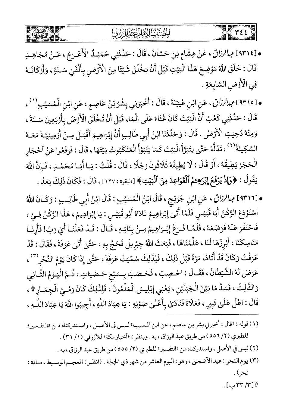9314- عبد الرزاق، عَن هِشَامِ بْنِ حَسَّانَ، قَالَ: حَدَّثَنِي حُمَيْدٌ الأَعْرَجُ، عَن مُجاهِدٍ قَالَ: خَلَقَ اللهُ مَوْضِعَ هَذَا الْبَيْتِ قَبْلَ أَنْ يَخْلُقَ شَيْئًا مِنَ الأَرْضِ بِأَلْفَيْ سَنَةٍ، وَأَرْكَانُهُ فِي الأَرْضِ السَّابِعَةِ.