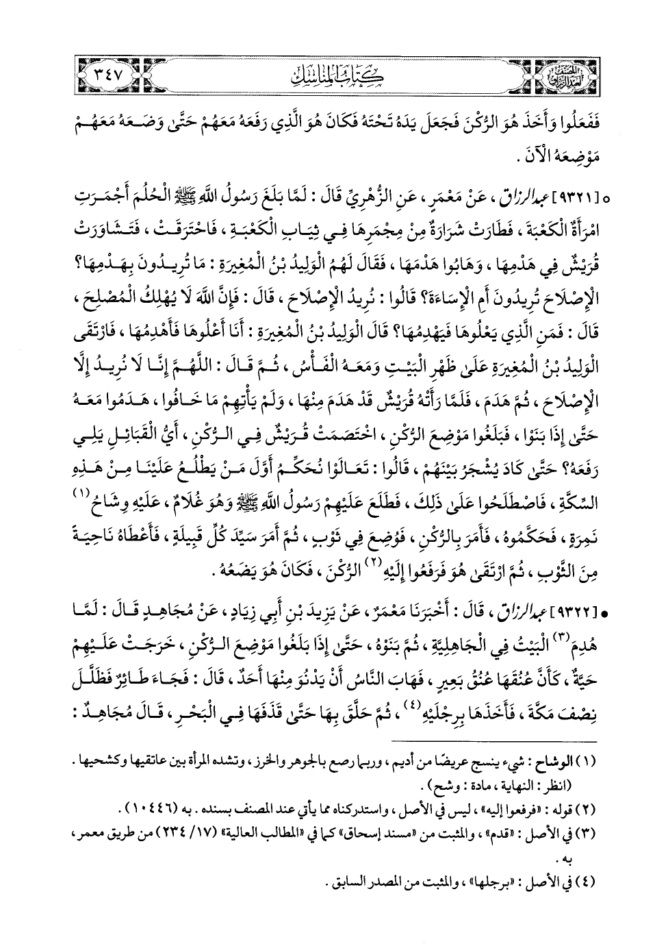 9321- عبد الرزاق، عَنْ مَعْمَرٍ، عَنِ الزُّهْرِيِّ، قَالَ: لَمَّا بَلَغَ رَسُولُ اللهِ صَلَّى اللهُ عَلَيْهِ وَسَلَّمَ الْحُلُمَ، أَجْمَرَتِ امْرَأَةٌ الْكَعْبَةَ، فَطَارَتْ شَرَارَةٌ مِنْ مِجْمَرِهَا فِي ثِيَابِ الْكَعْبَةِ، فَاحْتَرَقَتْ، فَتَشَاوَرَتْ قُرَيْشُ فِي هَدْمِهَا، وَهَابُوا هَدْمَهَا، فَقَالَ لَهُمُ الْوَلِيدُ بن المُغِيرَةِ: مَا تُرِيدُونَ بِهَدْمِهَا؟ الإِصْلاَحَ تُرِيدُونَ، أَمِ الإِسَاءَةُ؟ قَالُوا: نُرِيدُ الإِصْلاَحَ، قَالَ: فَإِنَّ اللهَ لاَ يُهْلِكُ المُصْلِحَ، قَالُوا: فَمَنِ الَّذِي يَعْلُوهَا فَيَهْدِمُهَا؟ قَالَ الْوَلِيدُ بن المُغِيرَةِ: أَنَا أَعْلُوهَا فَأَهْدِمُهَا، فَارْتَقَى الْوَلِيدُ بن المُغِيرَةِ عَلَى ظَهْرِ الْبَيْتِ، وَمَعَهُ الْفَأْسُ، ثُمَّ قَالَ: اللهُمَّ إِنَّا لاَ نُرِيدُ إِلاَّ الإِصْلاَحَ، ثُمَّ هَدَمَ، فَلَمَّا رَأَتْهُ قُرَيْشٌ قَدْ هَدَمَ مِنْهَا، وَلَمْ يَأْتِهِمْ مَا خَافُوا، هَدَمُوا مَعَهُ، حَتَّى إِذَا بَنَوْا، فَبَلَغُوا مَوْضِعَ الرُّكْنِ، اخْتَصَمَتْ قُرَيْشٌ فِي الرُّكْنِ، أَيُّ الْقَبَائِلِ يَلِي رَفْعَهُ؟ حَتَّى كَادَ يُشْجَرُ بَيْنَهُمْ، قَالُوا: تَعَالَوْا نُحَكِّمُ أَوَّلَ مَنْ يَطْلُعُ عَلَيْنَا مِنْ هَذِهِ السِّكَّةِ، فَاصْطَلَحُوا عَلَى ذَلِكَ، فَطَلَعَ عَلَيْهِمْ رَسُولُ اللهِ صَلَّى اللهُ عَلَيْهِ وَسَلَّمَ وَهُوَ غُلاَمٌ، عَلَيْهِ وِشَاحُ نَمِرَةٌ، فَحَكَّمُوهُ، فَأَمَرَ بِالرُّكْنِ، فَوُضِعَ فِي ثَوْبٍ، ثُمَّ أَمَرَ سَيِّدَ كُلِّ قَبِيلَةٍ، فَأَعْطَاهُ نَاحِيَةً مِنَ الثَّوْبِ، ثُمَّ ارْتَقَى هُوَ، فَرَفَعُوا إِلَيْهِ الرُّكْنَ، فَكَانَ هُوَ يَضَعُهُ.