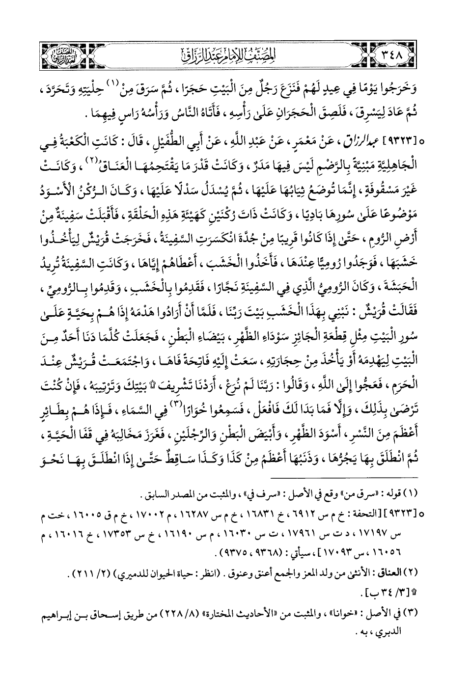 9323 - عبد الرزاق، عَنْ مَعْمَرٍ، عَنْ عَبدِ اللهِ (1)، عَنْ أَبِي الطُّفَيْلِ، قَالَ: كَانَتِ الْكَعْبَةُ فِي الْجَاهِلِيَّةِ مَبْنِيَّةً بِالرَّضْمِ، لَيْسَ فِيهَا مَدَرٌ، وَكَانَتْ قَدْرَ مَا يَقْتَحِمُهَا (2) الْعَنَاقُ، وَكَانَتْ غَيْرَ مَسْقُوفَةٍ، إِنَّمَا تُوضَعُ ثِيَابُهَا عَلَيْهَا، ثُمَّ يُسْدَلُ سَدْلاً عَلَيْهَا، وَكَانَ الرُّكْنُ الأَسْوَدُ مَوْضُوعًا عَلَى سُورِهَا، بَادِيًا، وَكَانَتْ ذَاتَ رُكْنَيْنِ كَهَيْئَةِ هَذِهِ الْحَلْقَةِ، فَأَقْبَلَتْ سَفِينَةٌ مِنْ أَرْضِ الرُّومِ، حَتَّى إِذَا كَانُوا قَرِيبًا مِنْ جُدَّةَ، انْكَسَرَتِ السَّفِينَةُ، فَخَرَجَتْ قُرَيْشٌ لِيَأْخُذُوا خَشَبَهَا، فَوَجَدُوا رُومِيًّا عِنْدَهَا، فَأَخَذُوا الْخَشَبَ، أَعْطَاهُمْ إِيَّاهَا، وَكَانَتِ السَّفِينَةُ تُرِيدُ الْحَبَشَةَ، وَكَانَ الرُّومِيُّ الَّذِي فِي السَّفِينَةِ نَجَّارًا، فَقَدِمُوا بِالْخَشَبِ، وَقَدِمُوا بِالرُّومِيِّ، فَقَالَتْ قُرَيْشٌ: نَبْنِي بِهَذَا الْخَشَبِ بَيْتَ رَبِّنَا، فَلَمَّا أَنْ أَرَادُوا هَدْمَهُ، إِذَا هُمْ بِحَيَّةٍ عَلَى سُورِ الْبَيْتِ، مِثْلِ قِطْعَةِ الْجَائِزِ، سَوْدَاءَ الظَّهْرِ، بَيْضَاءَ الْبَطْنِ،