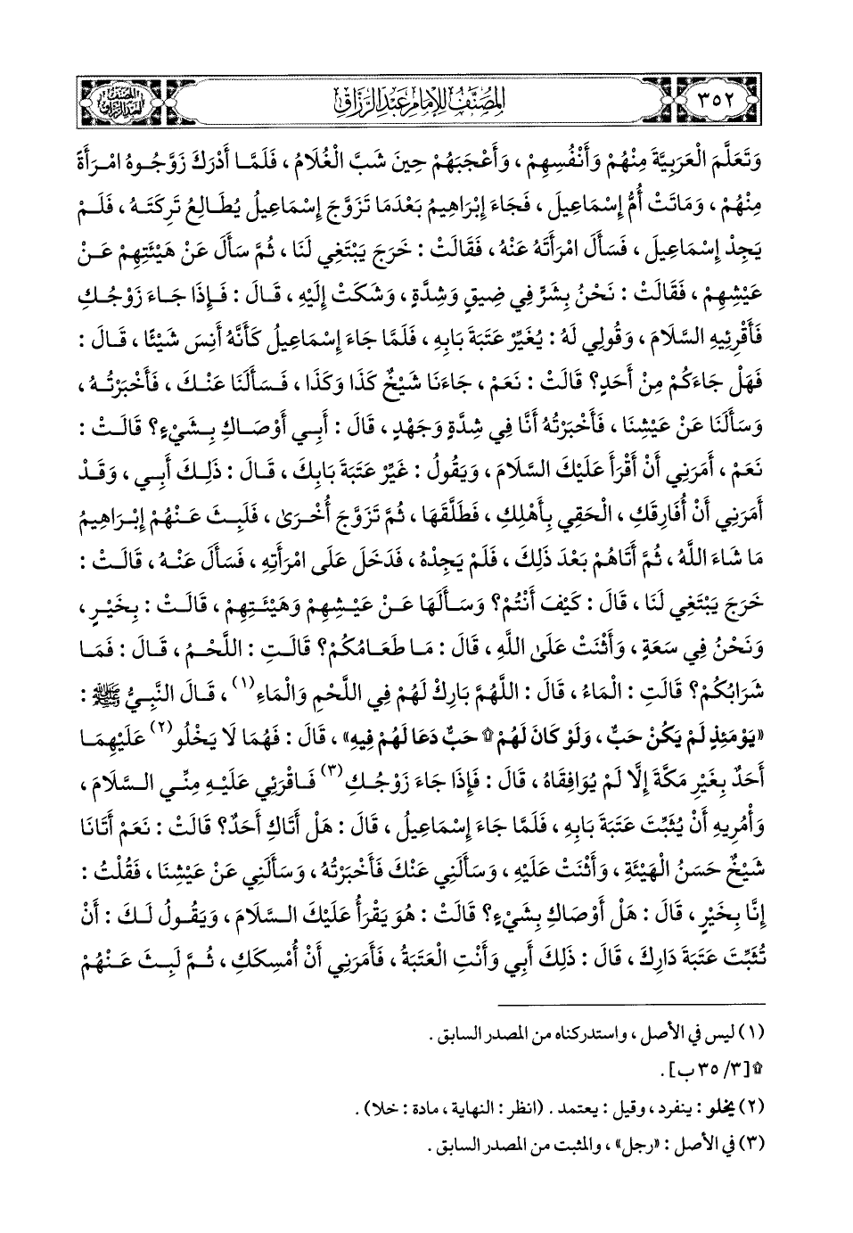 قَالَ: فَإِذَا جَاءَ زَوْجُكِ، فَاقْرَئِي عَلَيْهِ مِنِّي السَّلَامَ، وَأْمُرِيهِ أَنْ يُثَبِّتَ عَتَبَةَ بَابهِ، فَلمَّا جَاءَ إِسْمَاعِيلُ، قَالَ: هَلْ أَتَاكِ أَحَدٌ؟ قَالَتْ: نَعَمْ، أَتَانَا شَيْخٌ حَسَنُ الْهَيْئَةِ، وَأَثْنَتْ عَلَيْهِ، وَسَأَلَنِي عَنْكَ، فَأَخْبَرْتُهُ، وَسَأَلَنِي عَنْ عَيْشِنَا؟ فَقُلْتُ: إِنَّا بِخَيرٍ، قَالَ: هَلْ أَوْصَاكِ بِشَيْءٍ؟ قَالَتْ: هُوَ يَقْرَأُ عَلَيْكَ السَّلَامَ، وَيَقُولُ لَكَ أَنْ تُثَبِّتَ عَتَبَةَ دَارِكَ، قَالَ: ذَلِكَ أَبِي، وَأَنْتِ الْعَتَبَةُ، فَأَمَرَنِي أَن أُمْسِكَكِ،