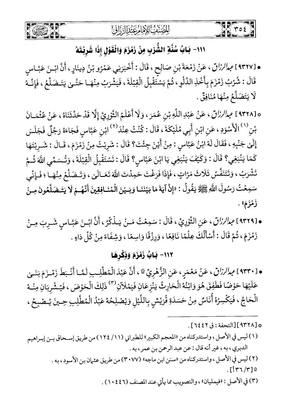 9328- عبد الرزاق، عَنْ عَبدِ اللهِ بْنِ عُمَرَ، وَلاَ أَعْلَمُ الثَّورِيَّ إِلاَّ قَدْ حَدَّثْنَاهُ عَن عُثْمَانَ بْنِ الأَسْوَدِ، عَنِ ابْنِ أَبِي مُلَيْكَةَ قَالَ: كُنْتُ عِنْدَ ابْنِ عَبَّاسٍ، فَجَاءَهُ رَجُلٌ، فَجَلَسَ إِلَى جَنْبِهِ، فَقَالَ لَهُ ابْنُ عَبَّاسٍ: مِنْ أَيْنَ جِئْتَ؟ قَالَ: شَرِبْتُ مِنْ زَمْزَمَ، قَالَ: شَرِبْتَهَا كَمَا يَنْبَغِي؟ قَالَ: وَكَيْفَ يَنْبَغِي يَا ابْنَ عَبَّاسٍ؟ قَالَ: تَسْتَقْبِلُ الْقِبْلَةَ، وَتُسَمِّي اللهَ، ثُمَّ تَشْرَبُ، وَتَتَنَفَّسُ ثَلاَثَ مَرَّاتٍ، فَإِذَا فَرَغْتَ حَمِدْتَ اللهَ تَعَالَى، وَتَضَلَّعُ مِنْهَا، فَإِنِّي سَمِعْتُ رَسُولَ اللهِ صَلَّى اللهُ عَلَيْهِ وَسَلَّمَ يَقُولُ: إِنَّ آيَةَ مَا بَيْنَنَا وَبَيْنَ المُنَافِقِينَ أَنَّهُمْ لاَ يَتَضَلَّعُونَ مِنْ زَمْزَمَ.