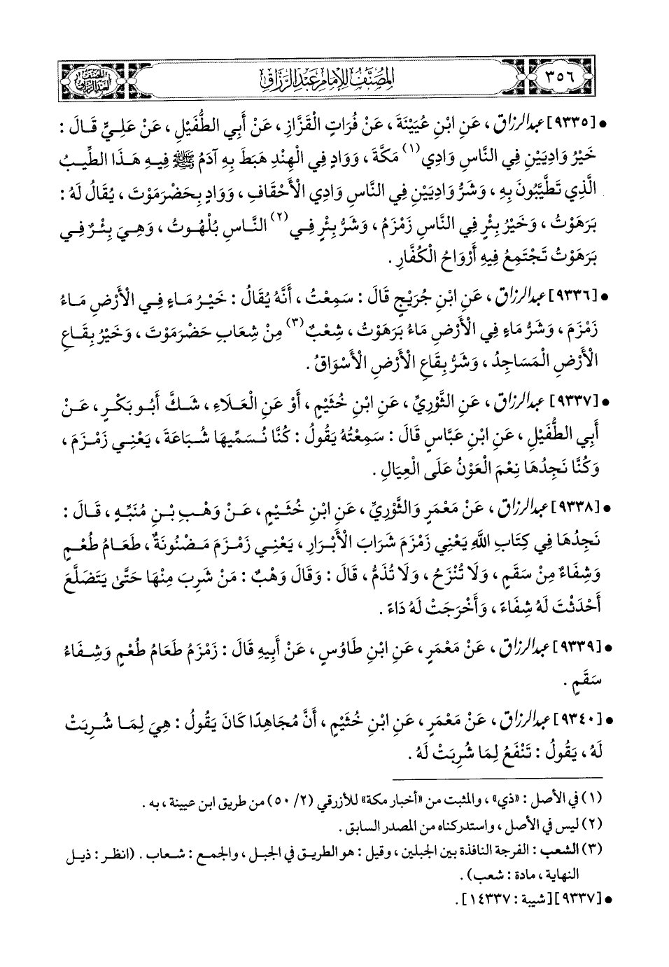 9337- عبد الرزاق، عَنِ الثَّورِيِّ، عَنِ ابْنِ خُثَيْمٍ، أَوْ عَنِ الْعَلاَءِ، شَكَّ أَبو بَكْرٍ، عَنْ أَبِي الطُّفَيْلِ، عَنِ ابْنِ عَبَّاسٍ، قَالَ: سَمِعْتُهُ يَقُولُ: كُنَّا نُسَمِّيهَا شُبَاعَةَ، يَعْنِي زَمْزَمَ، وَكُنَّا نَجِدُهَا نِعْمَ الْعَوْنُ عَلَى الْعِيَالِ.