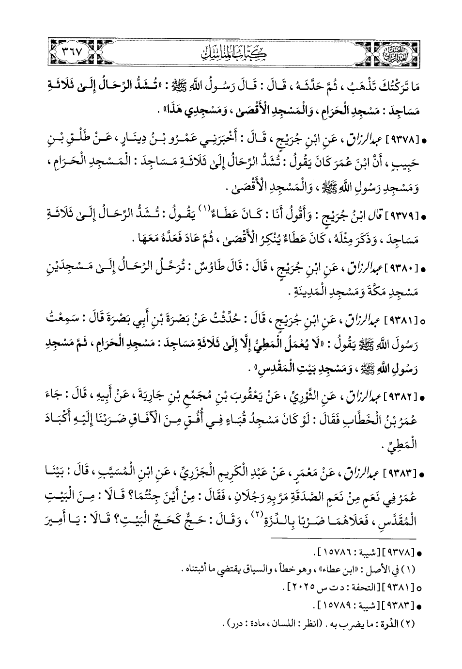 9378 - عبد الرزاق، عَنِ ابْنِ جُرَيْجٍ، قَالَ: أَخْبَرَنِي عَمْرُو بن دِينَارٍ، عَن طَلْقِ بْنِ حَبِيبٍ، أَنَّ ابْنَ عُمَرَ كَانَ يَقُولُ: تُشَدُّ (1) الرِّحَالُ إِلَى ثَلاَثَةِ مَسَاجِدَ: المَسْجِدِ الْحَرَامِ، وَمَسْجِدِ رَسُولِ اللهِ صَلَّى اللهُ عَلَيْهِ وَسَلَّمَ، وَالمَسْجِدِ الأَقْصَى.
