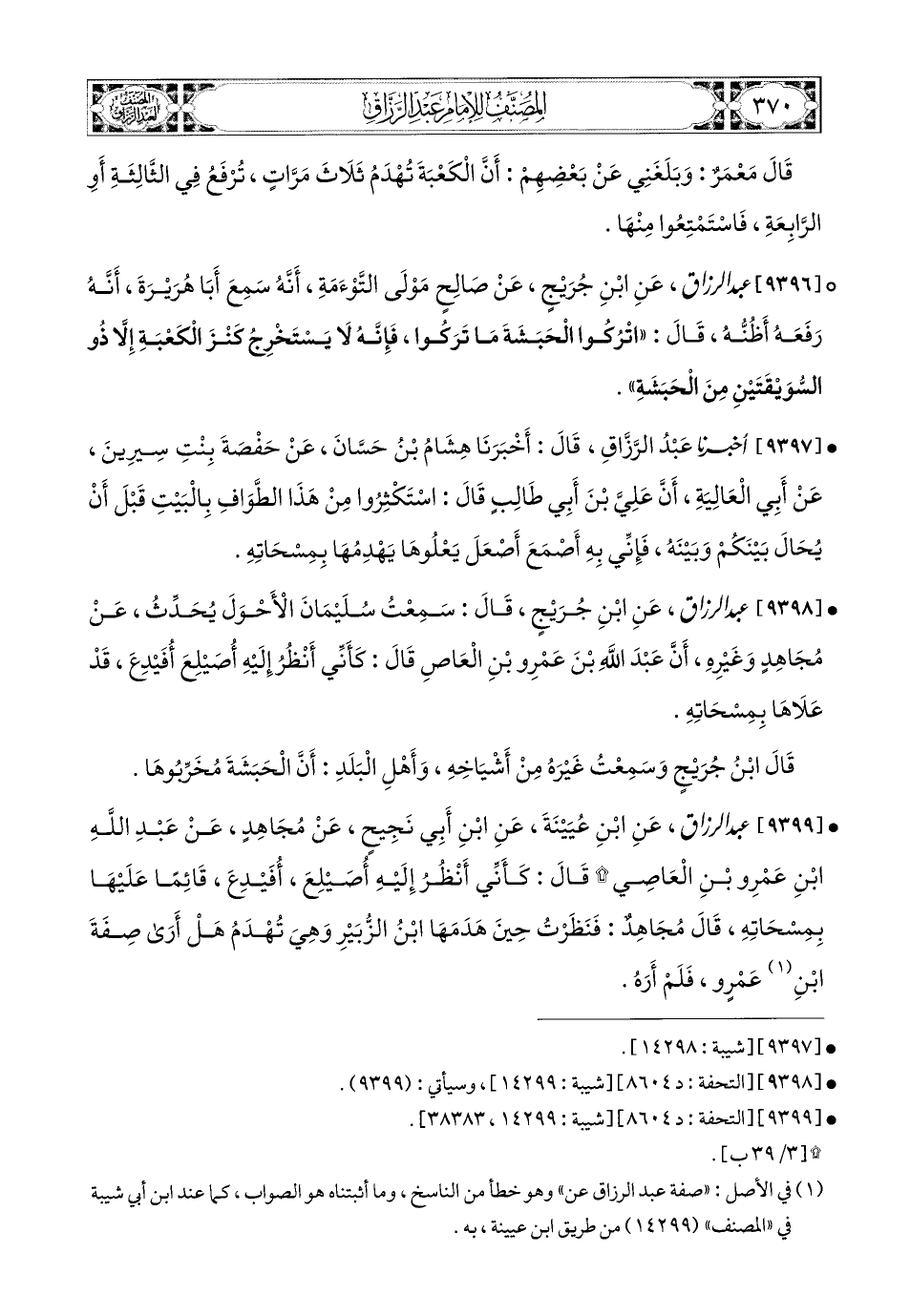 9396- عبد الرزاق، عَنِ ابْنِ جُرَيْجٍ، عَن صَالِحٍ، مَوْلَى التَّوْأَمَةِ، أَنَّهُ سَمِعَ أَبَا هُرَيرَةَ، أَنَّهُ رَفَعَهُ أَظُنُّهُ قَالَ: اتْرُكُوا الْحَبَشَةَ مَا تَرَكُوا، فَإِنَّهُ لاَ يَسْتَخْرِجُ كَنْزَ الْكَعْبَةِ إِلاَّ ذُو السُّوَيْقَتَيْنِ مِنَ الْحَبَشَةِ.