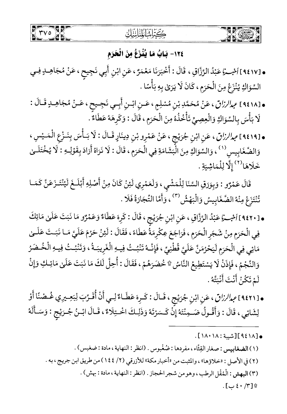 9421- عبد الرزاق، عَنِ ابْنِ جُرَيْجٍ، قَالَ: كَرِهَ عَطَاءٌ لِي أَنْ أُقَرِّبَ لِبَعِيرِي غُصْنًا، أَوْ لِشَاتِي، قَالَ: وَأَقُولُ ضَمِنْتَهُ إِنْ كَسَرْتَهُ، وَذَلِكَ اخْتِلاَءٌ، قَالَ ابْنُ جُرَيْجٍ: وَسَأَلَهُ ابْنُ أَبِي حُسَيْنٍ يَعْنِي عَطَاءً، قَالَ: أَبْسُطُ بِسَاطِي عَلَى نَبْتٍ فِي الْحَرَمِ، فَيَنْزِلُونَ عَلَيْهِ؟ قَالَ: نَعَمْ.