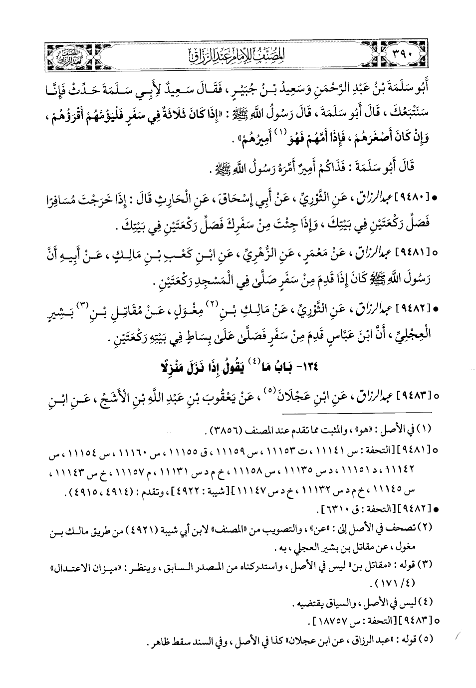 9481- عبد الرزاق، عَنْ مَعْمَرٍ، عَنِ الزُّهْرِيِّ، عَنِ ابْنِ كَعْبِ بْنِ مَالِكٍ، عَنْ أَبِيهِ؛ أَنَّ رَسُولَ اللهِ صَلَّى اللهُ عَلَيْهِ وَسَلَّمَ كَانَ إِذَا قَدِمَ مِنْ سَفَرٍ صَلَّى فِي المَسْجِدِ رَكْعَتَيْنِ.