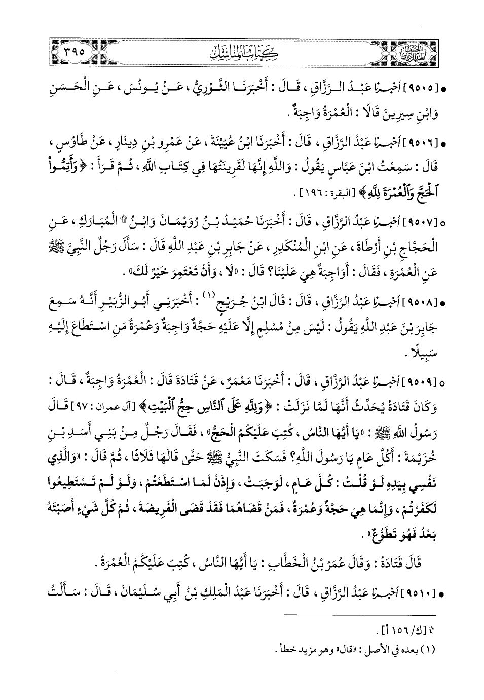 9505- أَخْبَرَنَا عَبْدُ الرَّزَّاقِ، قَالَ: أَخْبَرَنَا الثَّوْرِيِّ، عَنْ يُونُسَ، عَنِ الْحَسَنِ، وَابْنِ سِيرِينَ قَالاَ: الْعُمْرَةُ وَاجِبَةٌ.