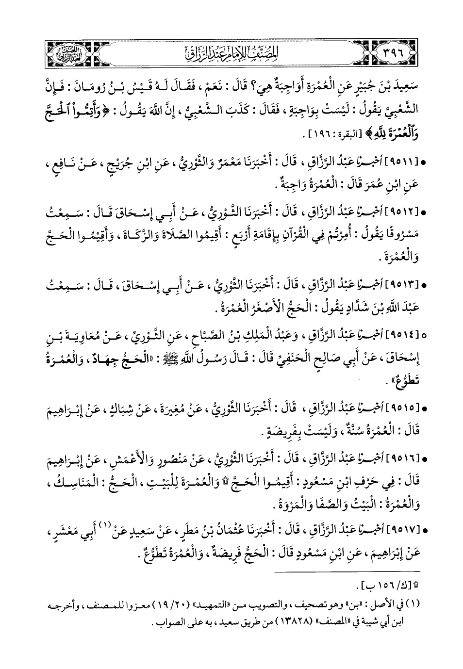 9511- أخبرنا عبد الرزاق، قَالَ: أَخْبَرَنَا مَعْمَرٌ، وَالثَّوْرِيُّ، عَنِ ابْنِ جُرَيْجٍ، عَنْ نَافِعٍ، عَنِ ابْنِ عُمَرَ قَالَ: الْعُمْرَةُ وَاجِبَةٌ.