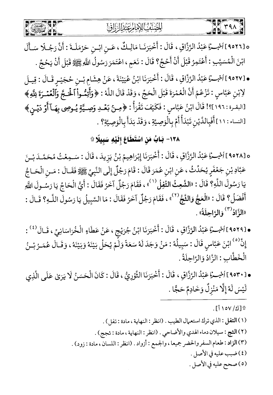9528- أخبرنا عبد الرزاق، قَالَ: أَخْبَرَنَا إِبْرَاهِيمُ بْنُ يَزِيدَ، قَالَ: سَمِعْتُ مُحَمَّدَ بْنَ عَبَّاِد بْنِ جَعْفَرٍ يُحَدِّثُ، عَنِ ابْنِ عُمَرَ قَالَ: قَامَ رَجُلٌ إِلَى النَّبِيِّ صَلى الله عَلَيه وسَلم فَقَالَ: مَنِ الْحَاجُّ يَا رَسُولَ اللهِ؟ قَالَ: الشَّعِثُ التَّفِلُ، فَقَامَ رَجُلٌ آخَرُ، فَقَالَ: أَيُّ الْحَاجِّ يَا رَسُولَ اللهِ أَفْضَلُ؟ قَالَ: الْعَجُّ وَالثَّجُّ، فَقَامَ رَجُلٌ آخَرُ، فَقَالَ: مَا السَّبِيلُ يَا رَسُولَ اللهِ؟ قَالَ: الزَّادُ وَالرَّاحِلَةُ.