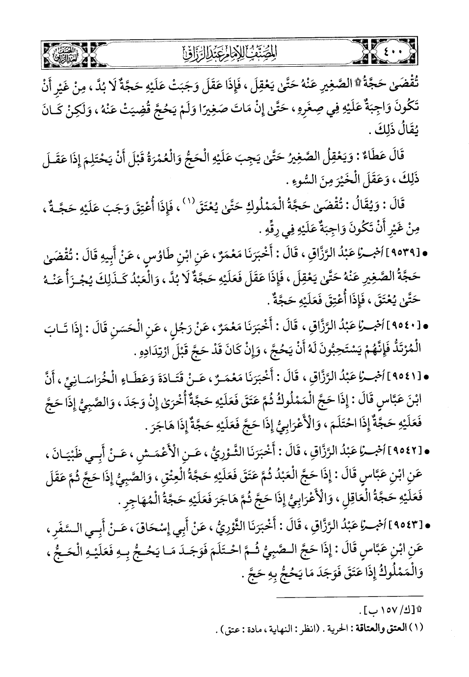 9539- أخبرنا عبد الرزاق، قَالَ: أَخْبَرَنَا مَعْمَرٌ، عَنِ ابْنِ طَاوُوسٍ، عَنْ أَبِيهِ قَالَ: تُقْضَى حَجَّةُ الصَّغِيرِ عَنْهُ حَتَّى يَعْقِلَ، فَإِذَا عَقَلَ فَعَلَيْهِ حَجَّةٌ لاَ بُدَّ، وَالْعَبْدُ كَذَلِكَ يُجْزَأُ عَنْهُ حَتَّى يُعْتَقَ، فَإِذَا أُعْتِقَ فَعَلَيْهِ حَجَّةٌ.