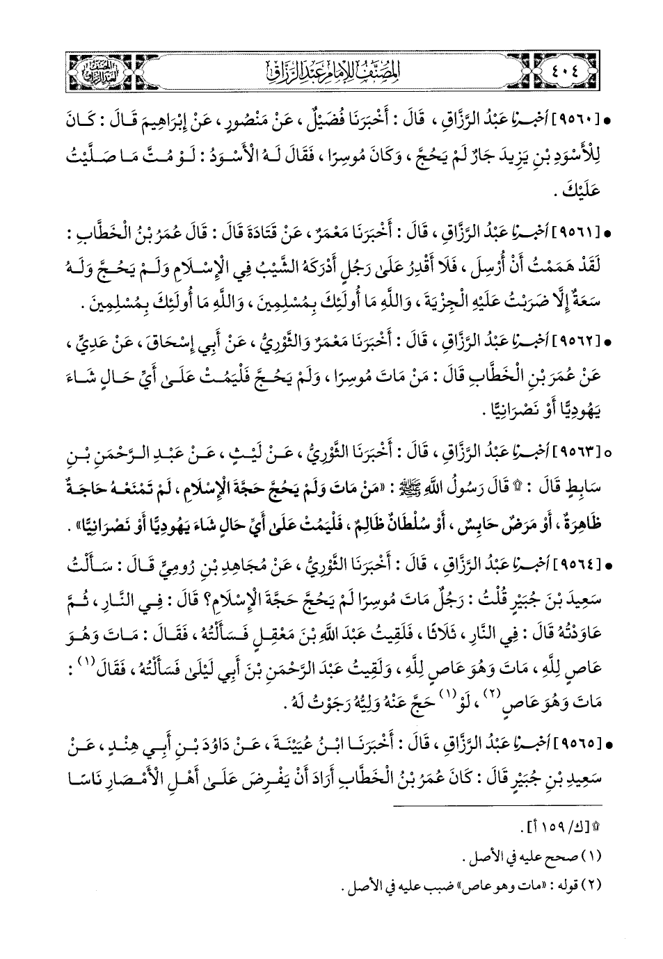 9562- أخبرنا عبد الرزاق، قَالَ: أَخْبَرَنَا مَعْمَرٌ، وَالثَّوْرِيُّ، عَنْ أَبِي إِسْحَاقَ، عَنْ عَدِيٍّ، عَنْ عُمَرَ بْنِ الْخَطَّابِ، قَالَ: مَنْ مَاتَ مُوسِرًا، وَلَمْ يَحُجَّ، فَلْيَمُتْ عَلَى أَيِّ حَالٍ شَاءَ، يَهُودِيًّا، أَوْ نَصْرَانِيًّا.