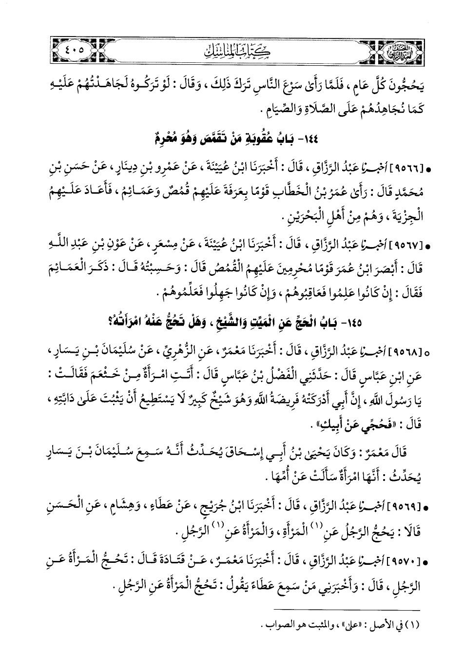 9567- أخبرنا عبد الرزاق، قَالَ: أَخْبَرَنَا ابْنُ عُيَيْنَةَ، عَنْ مِسْعَرٍ، عَنْ عَوْنِ بْنِ عَبْدِ اللهِ، قَالَ: أَبْصَرَ ابْنُ عُمَرَ قَوْمًا مُحْرِمِينَ عَلَيْهِمُ الْقُمُصَ، قَالَ: وَحَسِبْتُهُ قَالَ: ذَكَرَ الْعَمَائِمَ، فَقَالَ: إِنْ كَانُوا عَلِمُوا فَعَاقِبُوهُمْ، وَإِنْ كَانُوا جَهِلُوا فَعَلِّمُوهُمْ.
