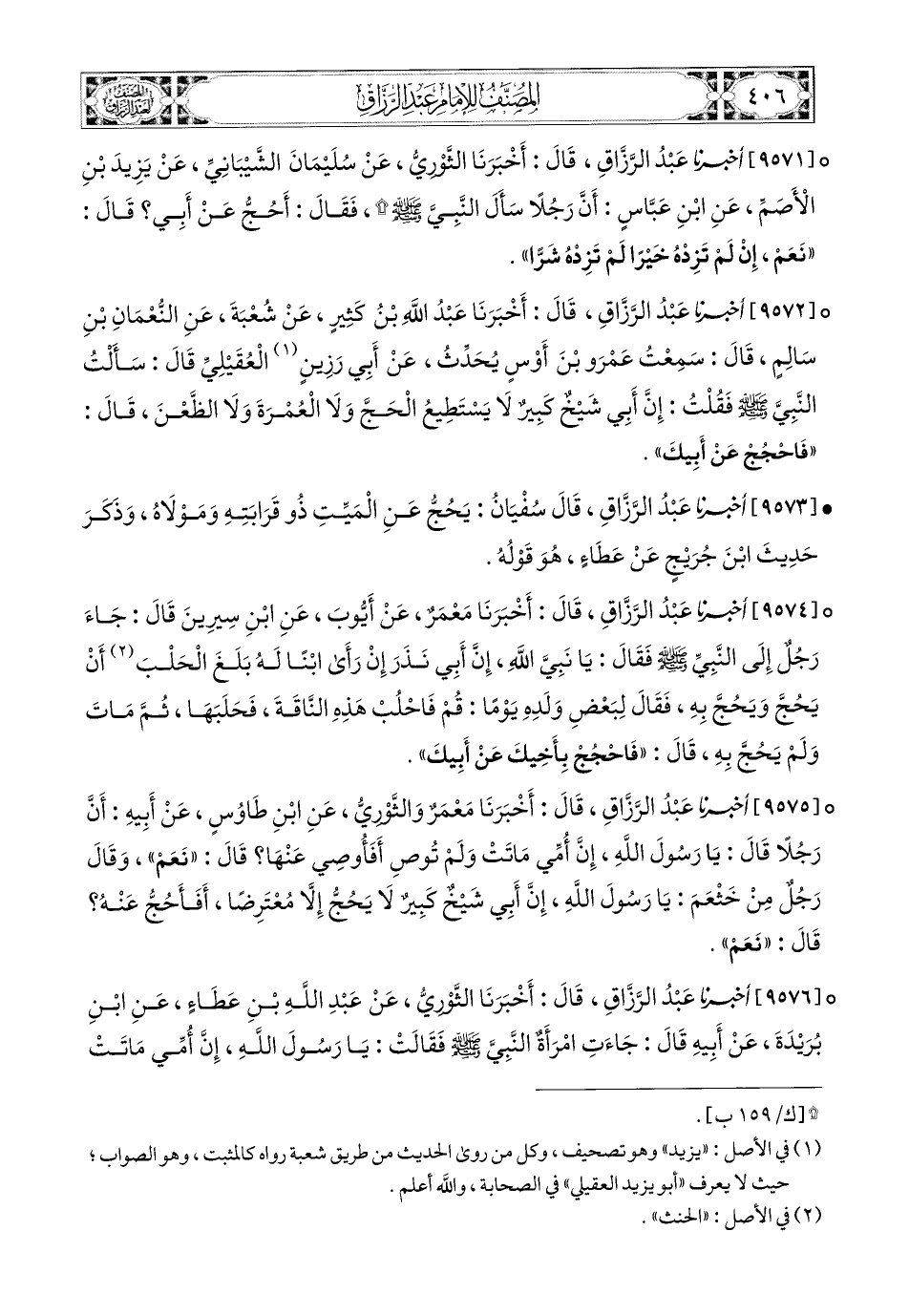 9571- أَخْبَرَنَا عَبْدُ الرَّزَّاقِ، قَالَ: أَخْبَرَنَا الثَّوْرِيُّ، عَنْ سُلَيْمَانَ الشَّيْبَانِيِّ، عَنْ يَزِيدَ بْنِ الأَصَمِّ، عَنِ ابْنِ عَبَّاسٍ، أَنَّ رَجُلاً سَأَلَ النَّبِيَّ صَلى الله عَلَيه وسَلم، فَقَالَ: أَحُجُّ عَنْ أَبِي؟ قَالَ: نَعَمْ، إِنْ لَمْ تَزِدْهُ خَيْرًا، لَمْ تَزِدْهُ شَرًّا.