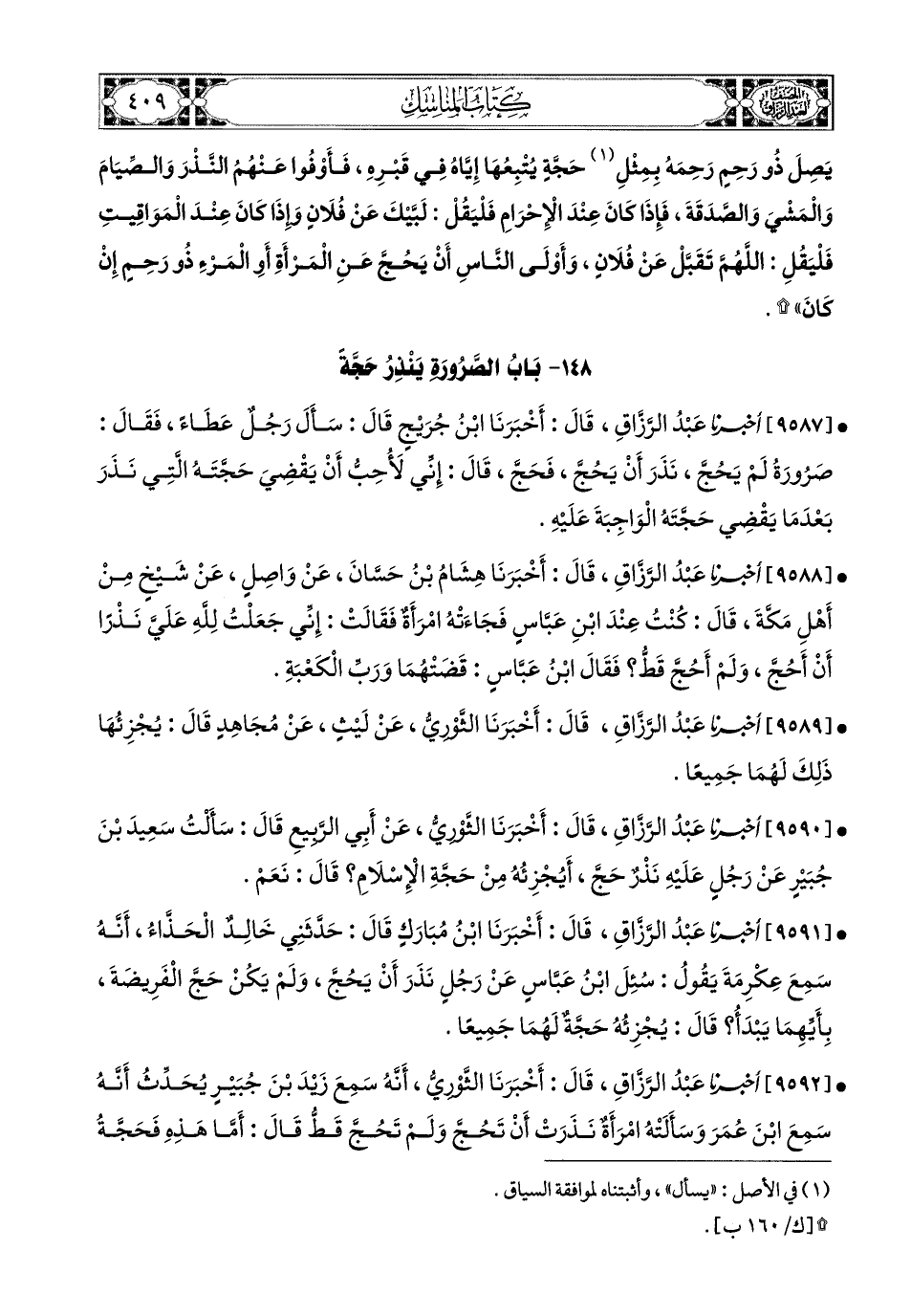 9592- أَخْبَرَنَا عَبْدُ الرَّزَّاقِ، قَالَ: أَخْبَرَنَا الثَّوْرِيُّ، أَنَّهُ سَمِعَ زَيْدَ بْنَ جُبَيْرٍ يُحَدِّثُ، أَنَّهُ سَمِعَ ابْنَ عُمَرَ، وَسَأَلَتْهُ امْرَأَةٌ نَذَرَتْ أَنْ تَحُجَّ وَلَمْ تَحُجَّ قَطُّ، قَالَ: أَمَّا هَذِهِ فَحَجَّةُ الإِسْلاَمِ، ثُمَّ يَنْبَغِي لَكَ أَن تُوَفِّيَ نَذْرَكَ، قَالَتْ: إِنِّي مُعْسِرَةٌ، قَالَ: فَدَعَا اللهَ أَنْ يُيَسِّرَ عَلَيْهَا.