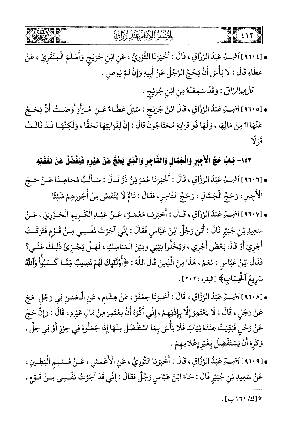 9606- أخبرنا عبد الرزاق، قَالَ: أَخْبَرَنَا عُمَرُ بْنُ ذَرٍّ، قَالَ: سَأَلْتُ مُجَاهِدًا عَنْ حَجِّ الأَجِيرِ، وَحَجِّ الجمَّال، وَحَجِّ التَّاجِرِ، فَقَالَ: تَامٌّ لاَ يَنْقُصُ مِنْ أُجُورِهِمْ شَيْئًا.