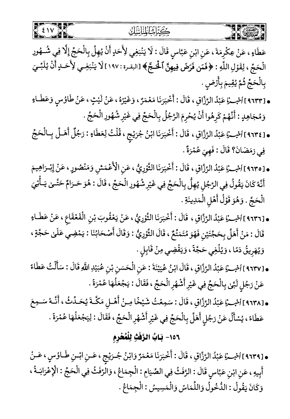 9633- أخبرنا عبد الرزاق، قَالَ: أَخْبَرَنَا مَعْمَرٌ، وَغَيْرُهُ، عَنْ لَيْثٍ، عَنْ طَاوُوسٍ، وَعَطَاءٍ، وَمُجَاهِدٍ: أَنَّهُمْ كَرِهُوا أَنْ يُحْرِمَ الرَّجُلُ بِالْحَجِّ، فِي غَيْرِ شُهُورِ الْحَجِّ.