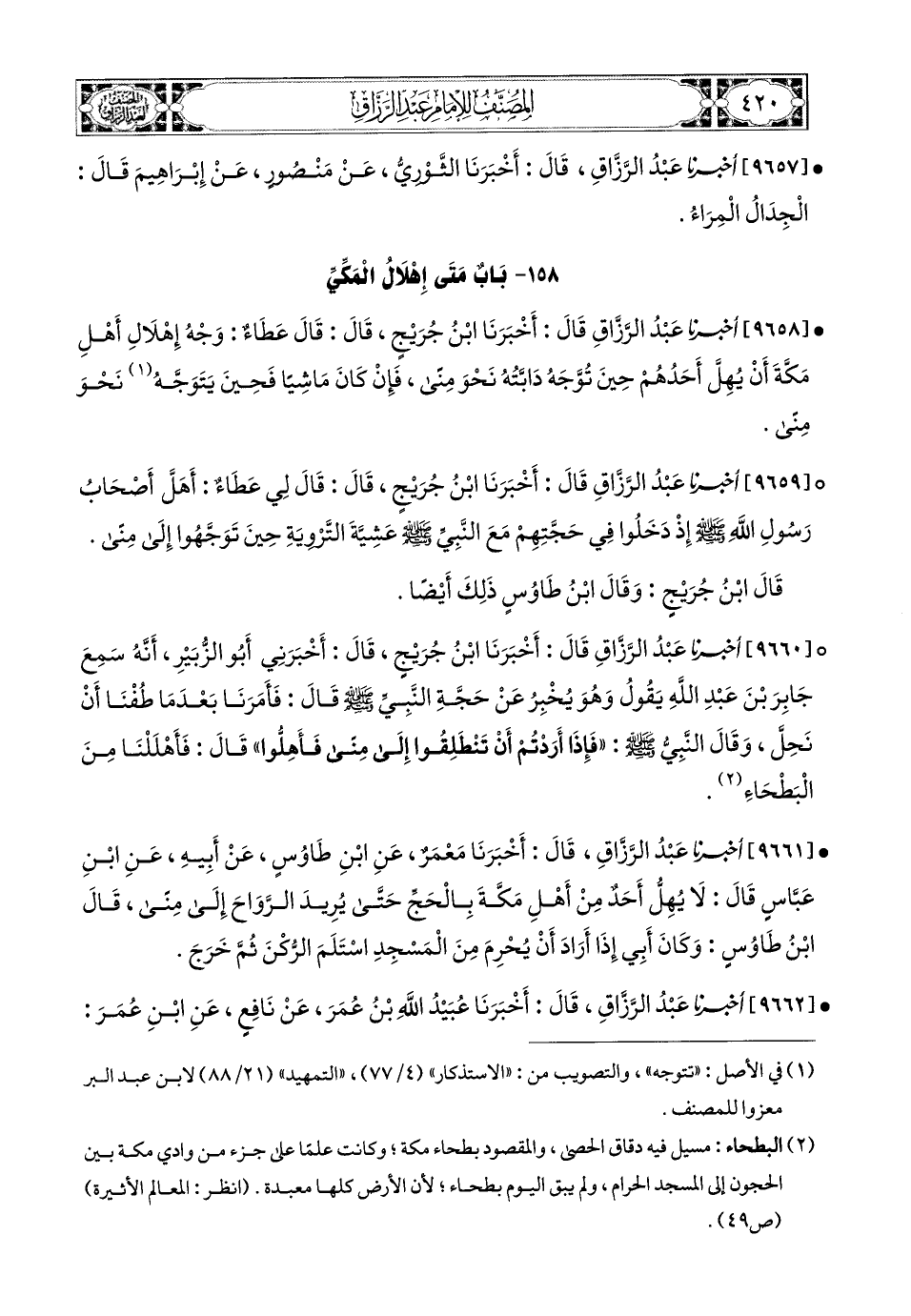 9658- أخبرنا عبد الرزاق، قَالَ: أَخْبَرَنَا ابْنُ جُرَيْجٍ، قَالَ: قَالَ عَطَاءٌ: وَجْهُ إِهْلاَلِ أَهْلِ مَكَّةَ، أَنْ يُهِلَّ أَحَدُهُمْ حِينَ تُوَجَّهُ دَابَّتُهُ نَحْوَ مِنًى، فَإِنْ كَانَ مَاشِيًا، فَحِينَ يَتَوَجَّهُ نَحْوَ مِنًى.