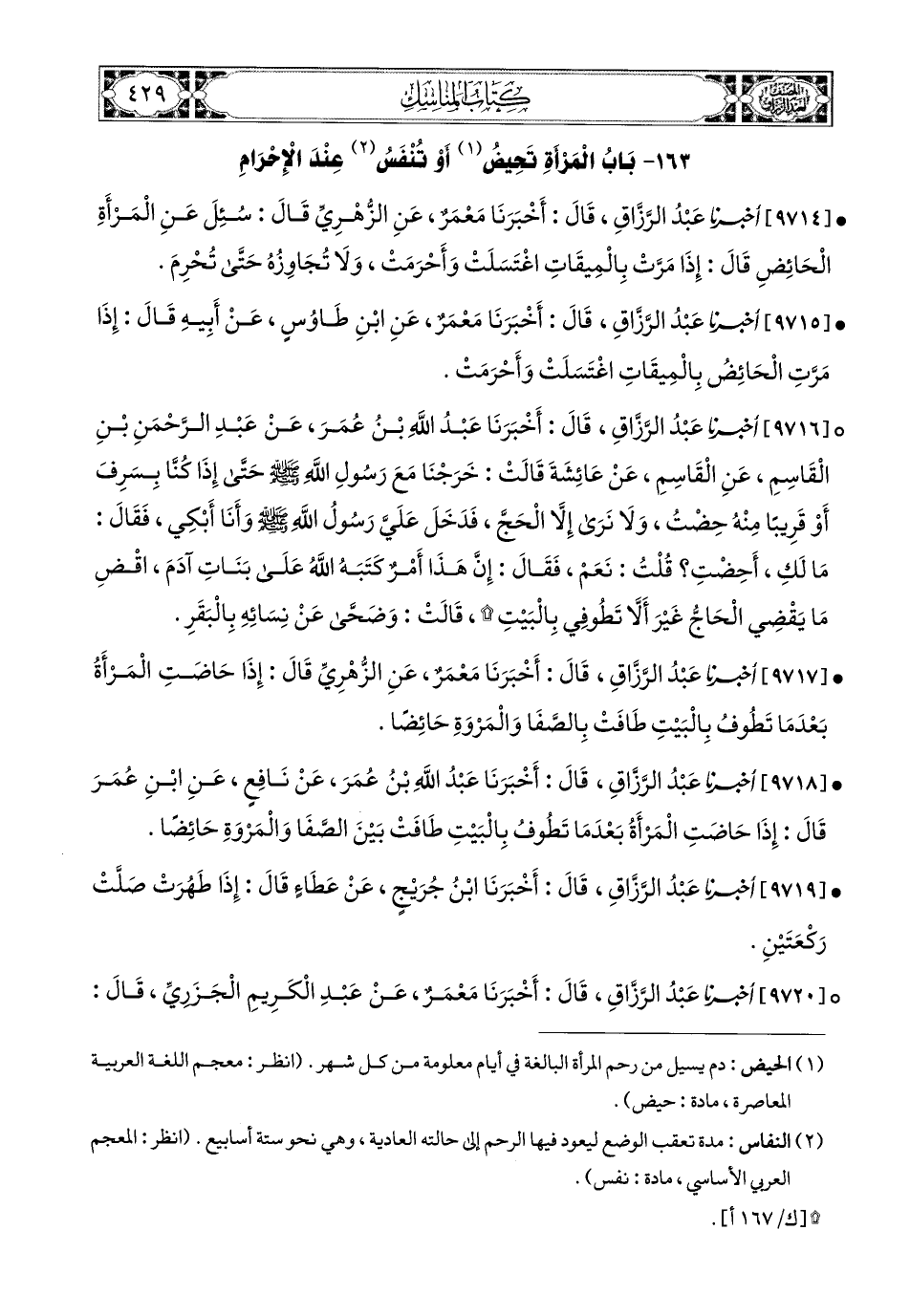 9714- أخبرنا عبد الرزاق، قَالَ: أَخْبَرَنَا مَعْمَرٌ، عَنِ الزُّهْرِيِّ قَالَ: سُئِلَ عَنِ الْمَرْأَةِ الْحَائِضِ قَالَ: إِذَا مَرَّتْ بِالْمِيقَاتِ، اغْتَسَلَتْ وَأَحْرَمَتْ، وَلاَ تُجَاوِزْهُ حَتَّى تُحْرِمَ.