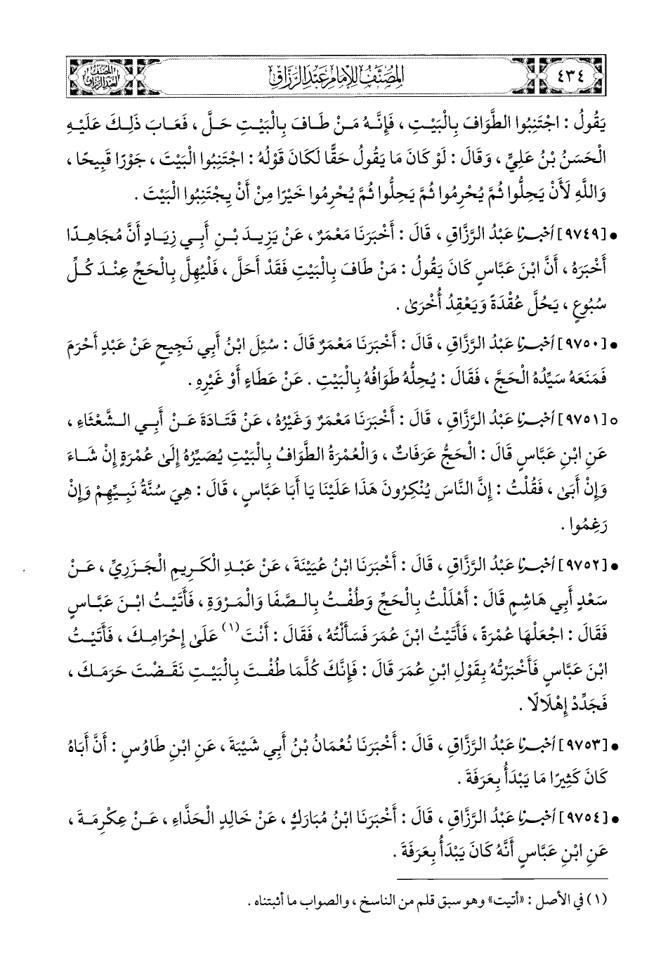 9754- أخبرنا عبد الرزاق، قَالَ: أَخْبَرَنَا ابْنُ مُبَارَكٍ، عَنْ خَالِدٍ الْحَذَّاءِ، عَنْ عِكْرِمَةَ، عَنِ ابْنِ عَبَّاسٍ، أَنَّهُ كَانَ يَبْدَأُ بِعَرَفَةَ.
