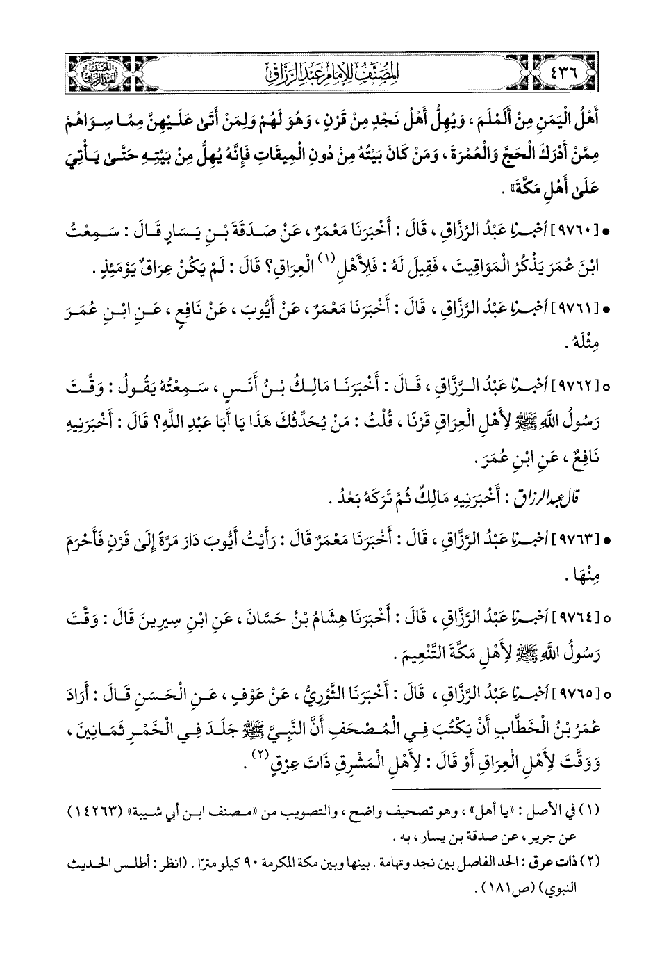 9762- أخبرنا عبد الرزاق، قَالَ: أَخْبَرَنَا مَالِكُ بْنُ أَنَسٍ، سَمِعْتُهُ يَقُولُ: وَقَّتَ رَسُولُ اللهِ صَلى الله عَلَيه وسَلم لأَهْلِ الْعِرَاقِ قَرْنًا، قُلْتُ: مَنْ يُحَدِّثُكَ هَذَا يَا أَبَا عَبْدِ اللهِ؟ قَالَ: أَخْبَرَنِيهِ نَافِعٌ، عَنِ ابْنِ عُمَرَ.