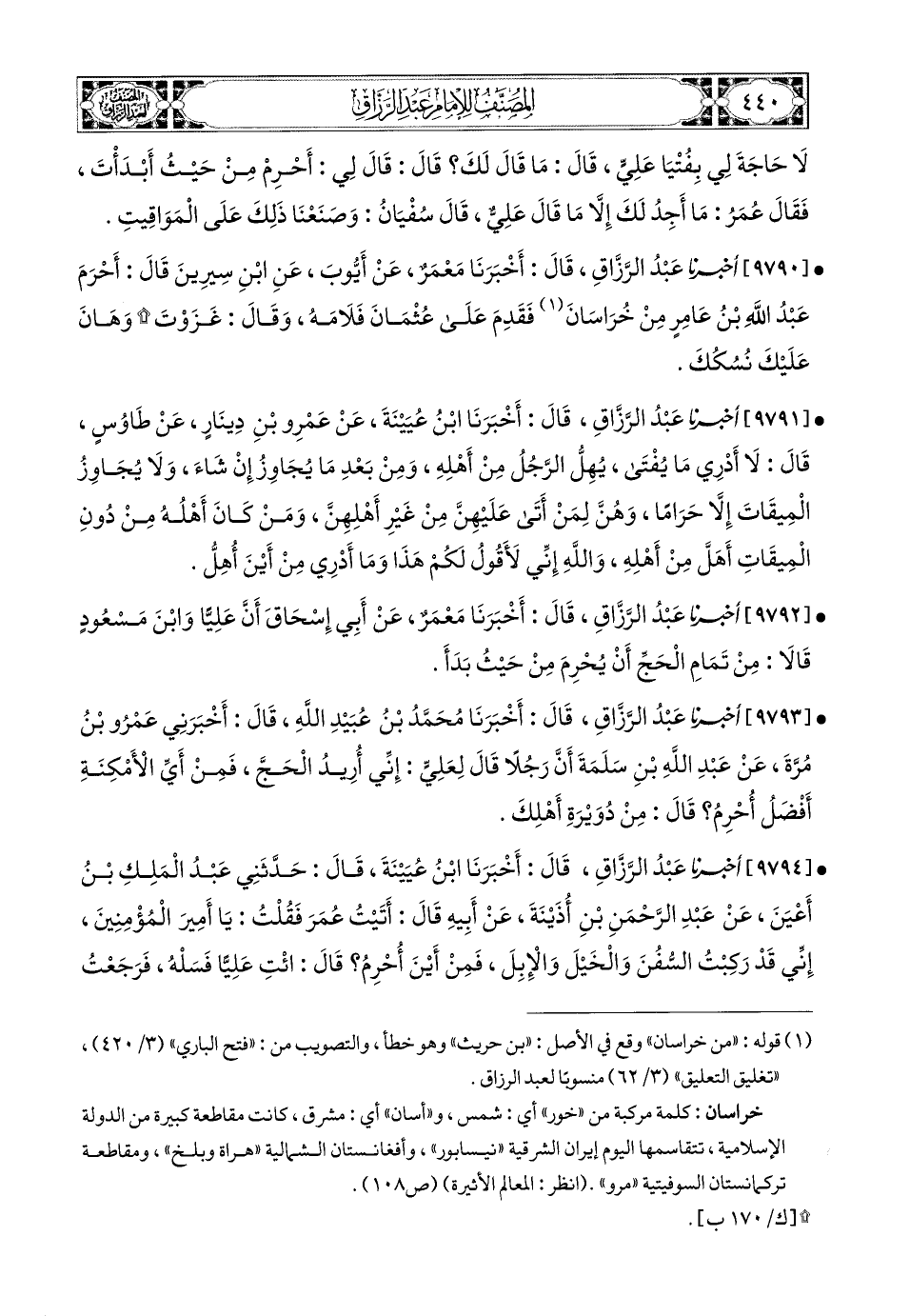 9792- أخبرنا عبد الرزاق، قَالَ: أَخْبَرَنَا مَعْمَرٌ، عَنْ أَبِي إِسْحَاقَ، أَنَّ عَلِيًّا، وَابْنَ مَسْعُودٍ قَالاَ: مِنْ تَمَامِ الْحَجِّ أَنْ يُحْرِمَ مِنْ حَيْثُ بَدَأَ.