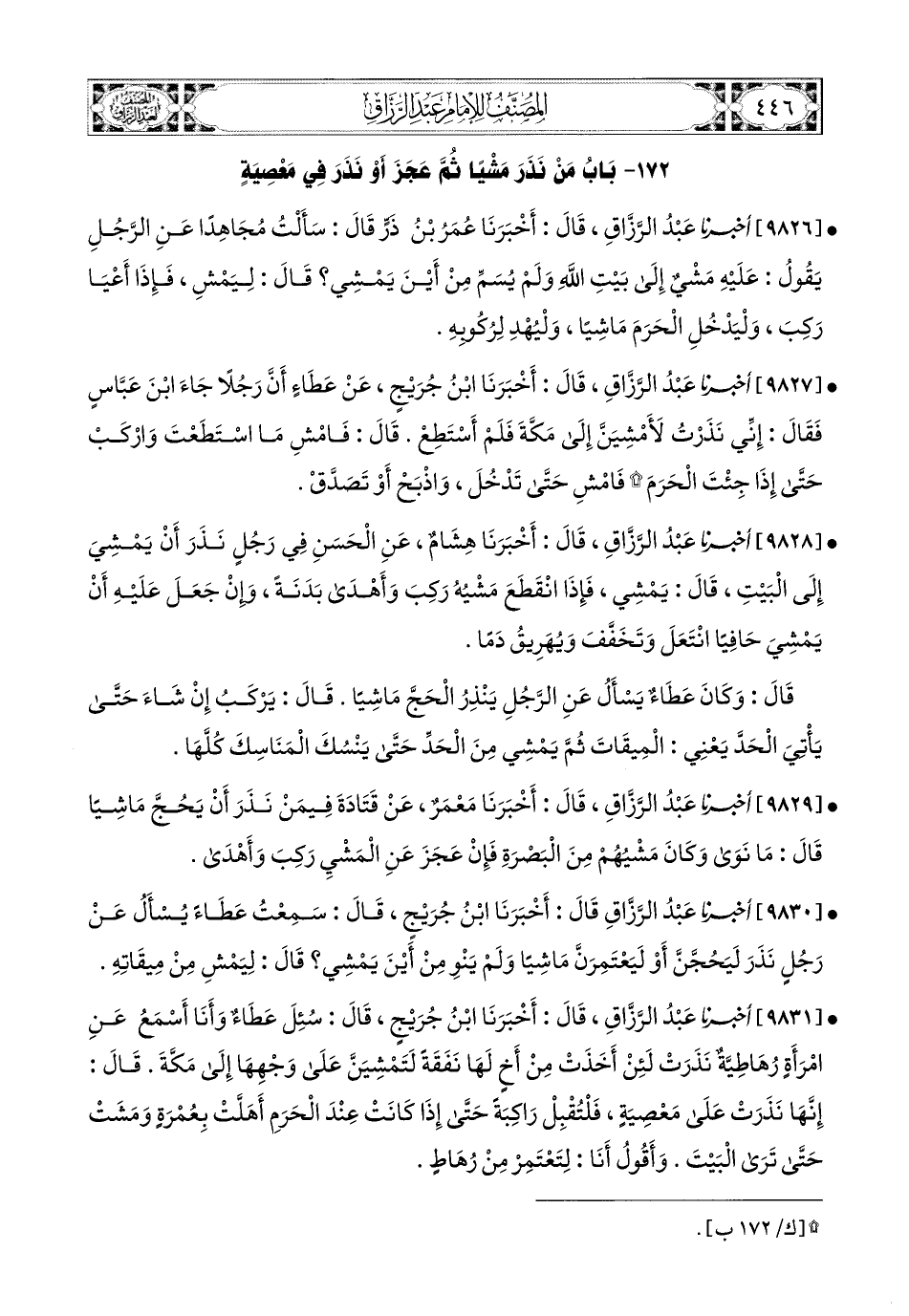 9831- أخبرنا عبد الرزاق، قَالَ: أَخْبَرَنَا ابْنُ جُرَيْجٍ، قَالَ: سُئِلَ عَطَاءٌ وَأَنَا أَسْمَعُ عَنِ امْرَأَةٍ رُهَاطِيَّةٌ نَذَرَتْ لَئِنْ أَخَذَتْ مِنْ أَخٍ لَهَا نَفَقَةً لَتَمْشِيَنَّ عَلَى وَجْهِهَا إِلَى مَكَّةَ، قَالَ: إِنَّهَا نَذَرَتْ عَلَى مَعْصِيَةٍ، فَلْتُقْبِلْ رَاكِبَةً، حَتَّى إِذَا كَانَتْ عِنْدَ الْحَرَمِ أَهَلَّتْ بِعُمْرَةٍ، وَمَشَتْ، حَتَّى تَرَى الْبَيْتَ، وَأَقُولُ أَنَا: لِتَعْتَمِرْ مِنْ رُهَاطٍ.
