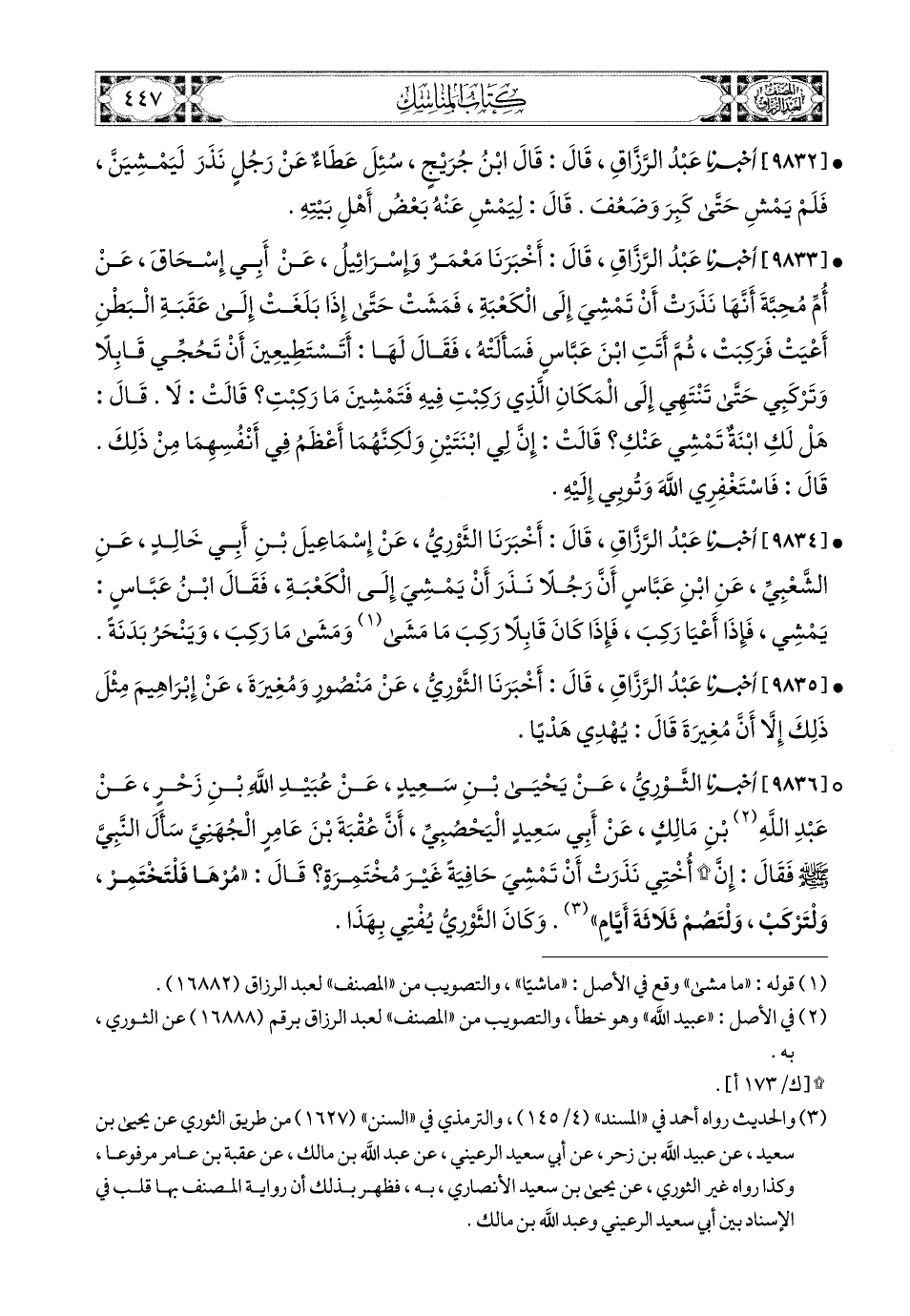 9834- أَخْبَرَنَا عَبْدُ الرَّزَّاقِ، قَالَ: أَخْبَرَنَا الثَّوْرِيِّ، عَنْ إِسْمَاعِيلَ بْنِ أَبِي خَالِدٍ، عَنِ الشَّعْبِيِّ، عَنِ ابْنِ عَبَّاسٍ، أَنَّ رَجُلاً نَذَرَ أَنْ يَمْشِيَ إِلَى الْكَعْبَةِ، فَقَالَ ابْنُ عَبَّاسٍ: يَمْشِي، فَإِذَا أَعْيَا رَكِبَ، فَإِذَا كَانَ قَابِلاً رَكِبَ مَا مَشَى، وَمَشَى مَا رَكِبَ، وَيَنْحَرُ بَدَنَةً.