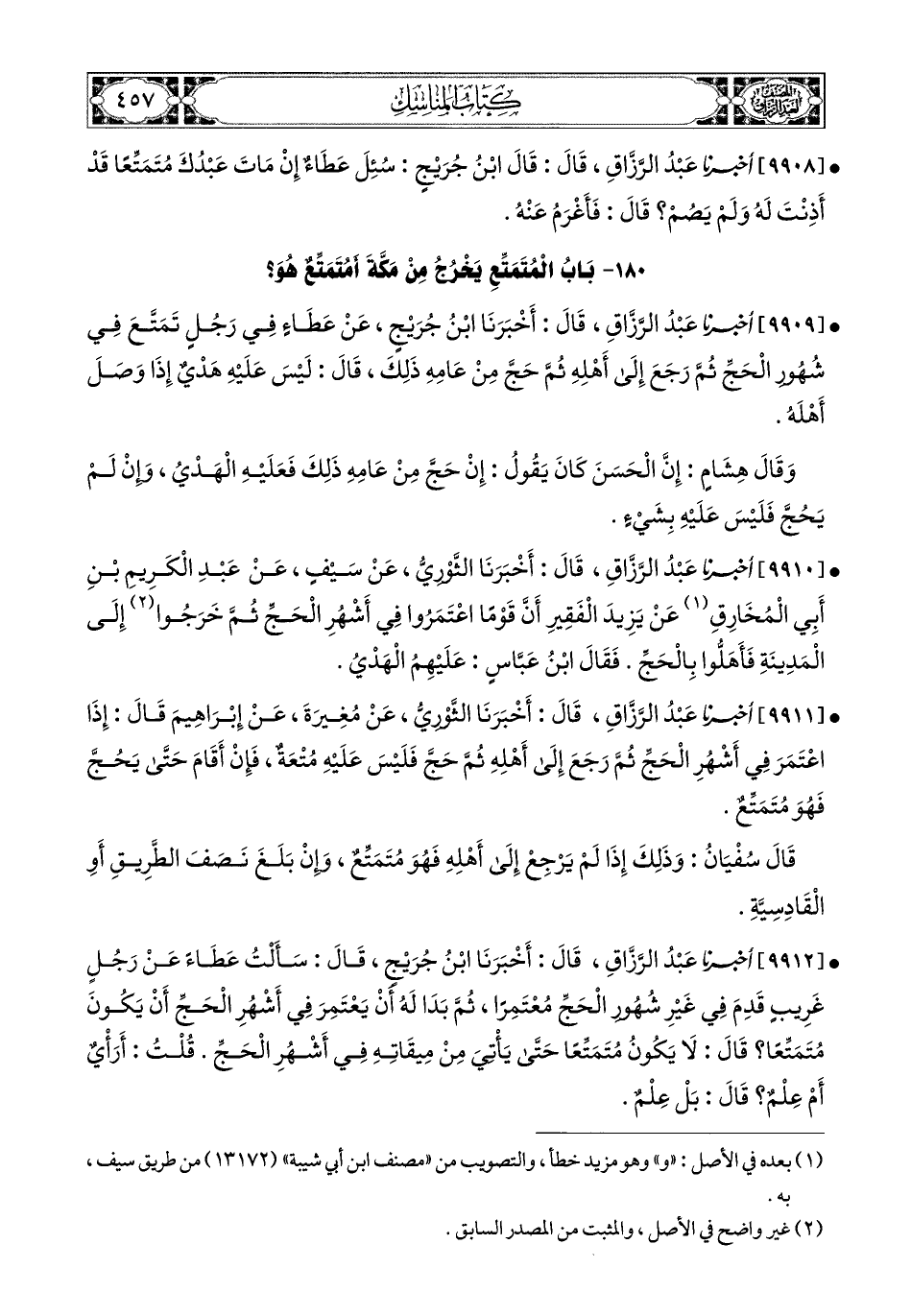 9912- أخبرنا عبد الرزاق، قَالَ: أَخْبَرَنَا ابْنُ جُرَيْجٍ، قَالَ: سَأَلْتُ عَطَاءً عَنْ رَجُلٍ غَرِيبٍ، قَدِمَ فِي غَيْرِ شُهُورِ الْحَجِّ مُعْتَمِرًا، ثُمَّ بَدَا لَهُ أَنْ يَعْتَمِرَ فِي أَشْهُرِ الْحَجِّ أَنْ يَكُونَ مُتَمَتِّعًا؟ قَالَ: لاَ يَكُونُ مُتَمَتِّعًا، حَتَّى يَأْتِيَ مِنْ مِيقَاتِهِ فِي أَشْهُرِ الْحَجِّ، قُلْتُ: أَرَأْيٌ أَمْ عِلْمٌ؟ قَالَ: بَلْ عِلْمٌ.