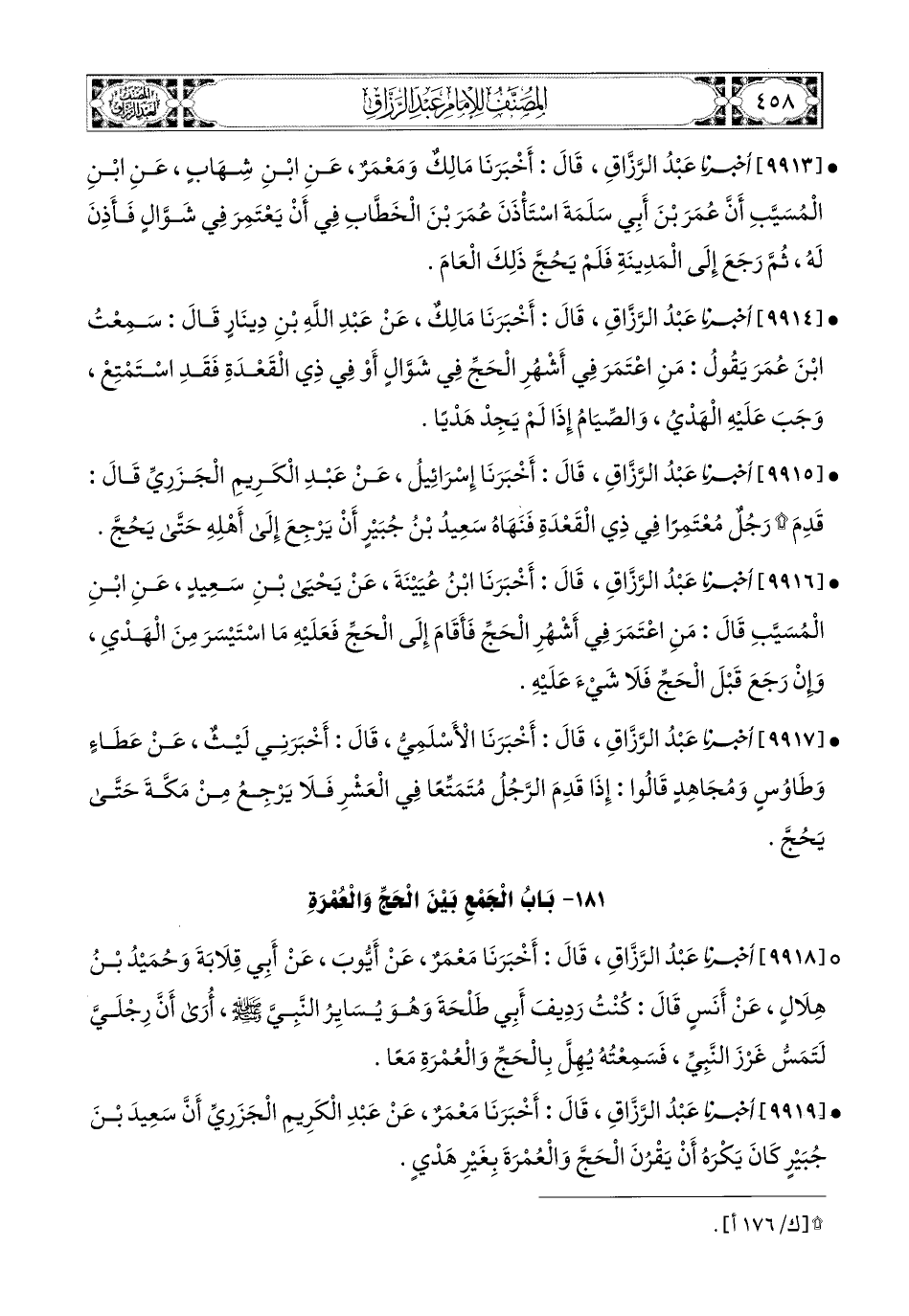 9915- أخبرنا عبد الرزاق، قَالَ: أَخْبَرَنَا إِسْرَائِيلُ، عَنْ عَبْدِ الْكَرِيمِ الْجَزَرِيِّ، قَالَ: قَدِمَ رَجُلٌ مُعْتَمِرًا فِي ذِي الْقَعْدَةِ، فَنَهَاهُ سَعِيدُ بْنُ جُبَيْرٍ أَنْ يَرْجِعَ إِلَى أَهْلِهِ، حَتَّى يَحُجَّ.
