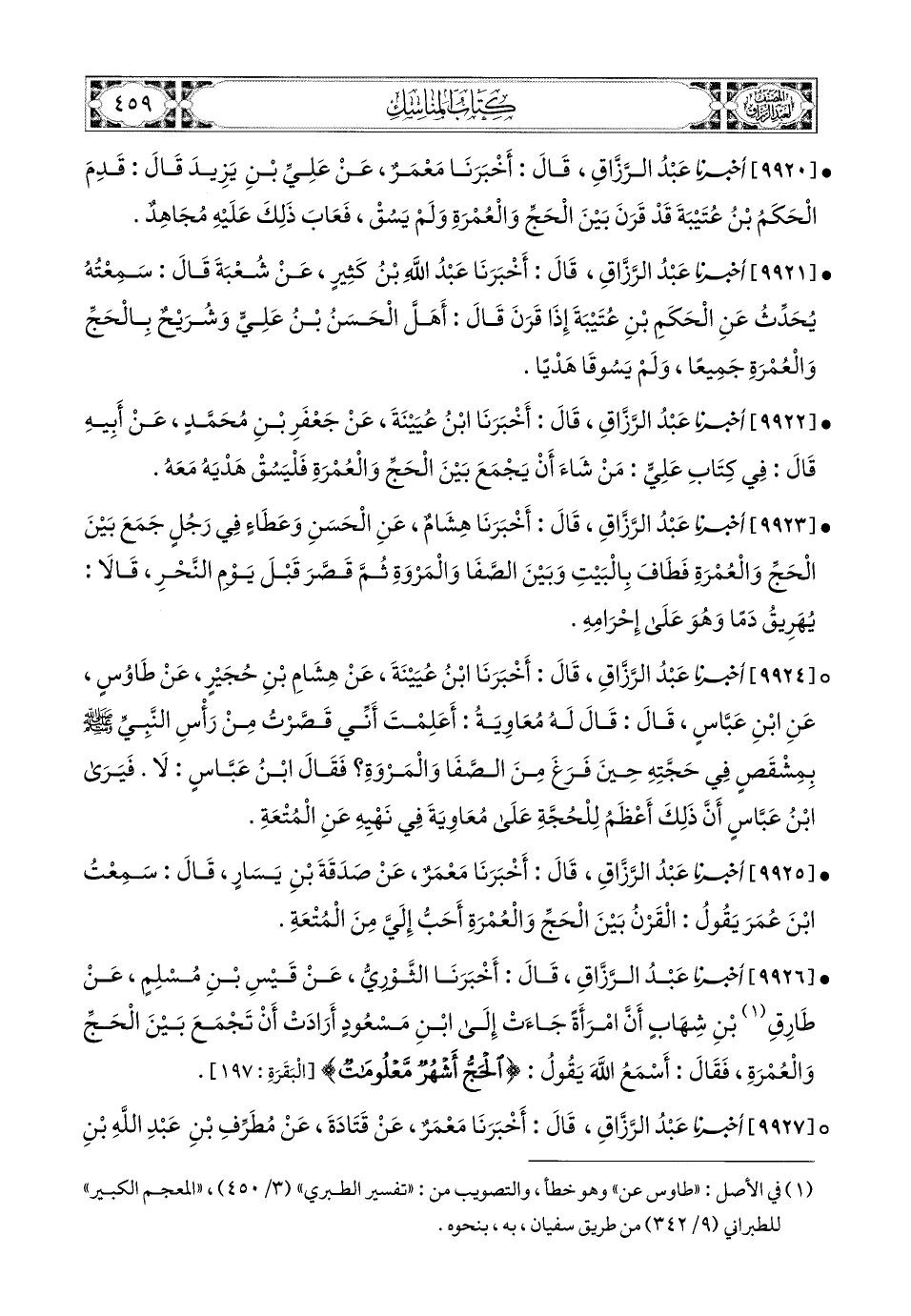 9925- أخبرنا عبد الرزاق، قَالَ: أَخْبَرَنَا مَعْمَرٌ، عَنْ صَدَقَةَ بْنِ يَسَارٍ، قَالَ: سَمِعْتُ ابْنَ عُمَرَ يَقُولُ: الْقَرْنُ بَيْنَ الْحَجِّ وَالْعُمْرَةِ، أَحَبُّ إِلَيَّ مِنَ الْمُتْعَةِ.