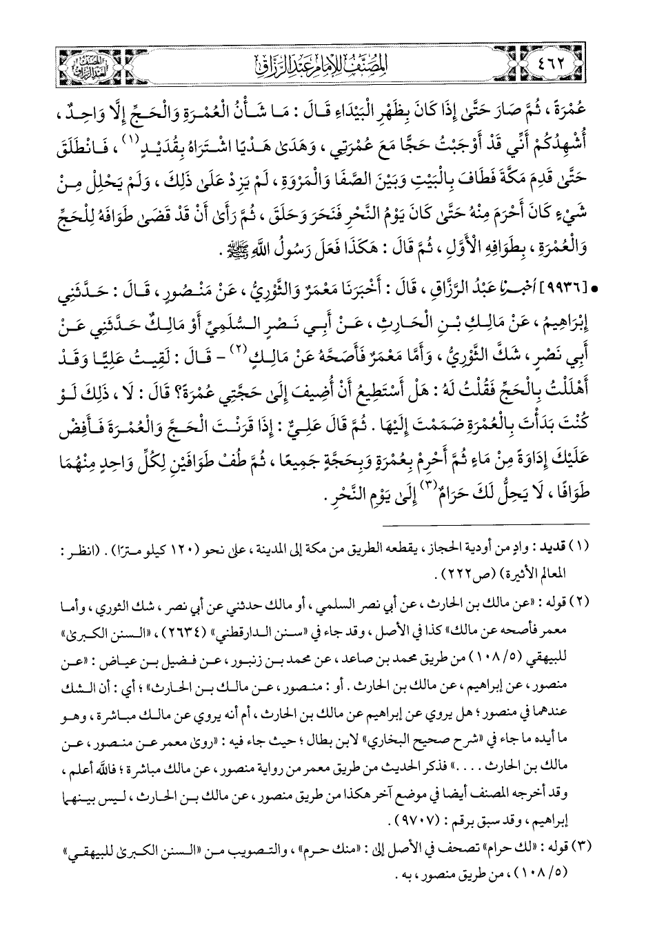 9936- أخبرنا عبد الرزاق، قَالَ: أَخْبَرَنَا مَعْمَرٌ، وَالثَّوْرِيُّ، عَنْ مَنْصُورٍ، قَالَ: حَدَّثَنِي إِبْرَاهِيمُ، عَنْ مَالِكِ بْنِ الْحَارِثِ، عَنْ أَبِي نَصْرٍ السُّلَمِيِّ، أَوْ مَالِكٍ حَدَّثَنِي، عَنْ أَبِي نَصْرٍ، شَكَّ الثَّوْرِيُّ، وَأَمَّا مَعْمَرٌ فَأَصَحَّهُ عَنْ مَالِكٍ، قَالَ: لَقِيتُ عَلِيًّا وَقَدْ أَهْلَلْتُ بِالْحَجِّ، فَقُلْتُ لَهُ: هَلْ أَسْتَطِيعُ أَنْ أُضِيفَ إِلَى حَجَّتِي عُمْرَةً؟ قَالَ: لاَ، ذَلِكَ لَوْ كُنْتَ بَدَأْتَ بِالْعُمْرَةِ ضَمَمْتَ إِلَيْهَا، ثُمَّ قَالَ عَلِيٌّ: إِذَا قَرَنْتَ الْحَجَّ وَالْعُمْرَةَ فَأَفِضْ عَلَيْكَ إِدَاوَةً مِنْ مَاءٍ، ثُمَّ أَحْرَمَ بِعُمْرَةٍ وَبِحَجَّةٍ جَمِيعًا، ثُمَّ طُفْ طَوَافَيْنِ، لِكُلِّ وَاحِدٍ مِنْهُمَا طَوَافًا، لاَ يَحِلُّ لَكَ حَرَامٌ إِلَى يَوْمِ النَّحْرِ.