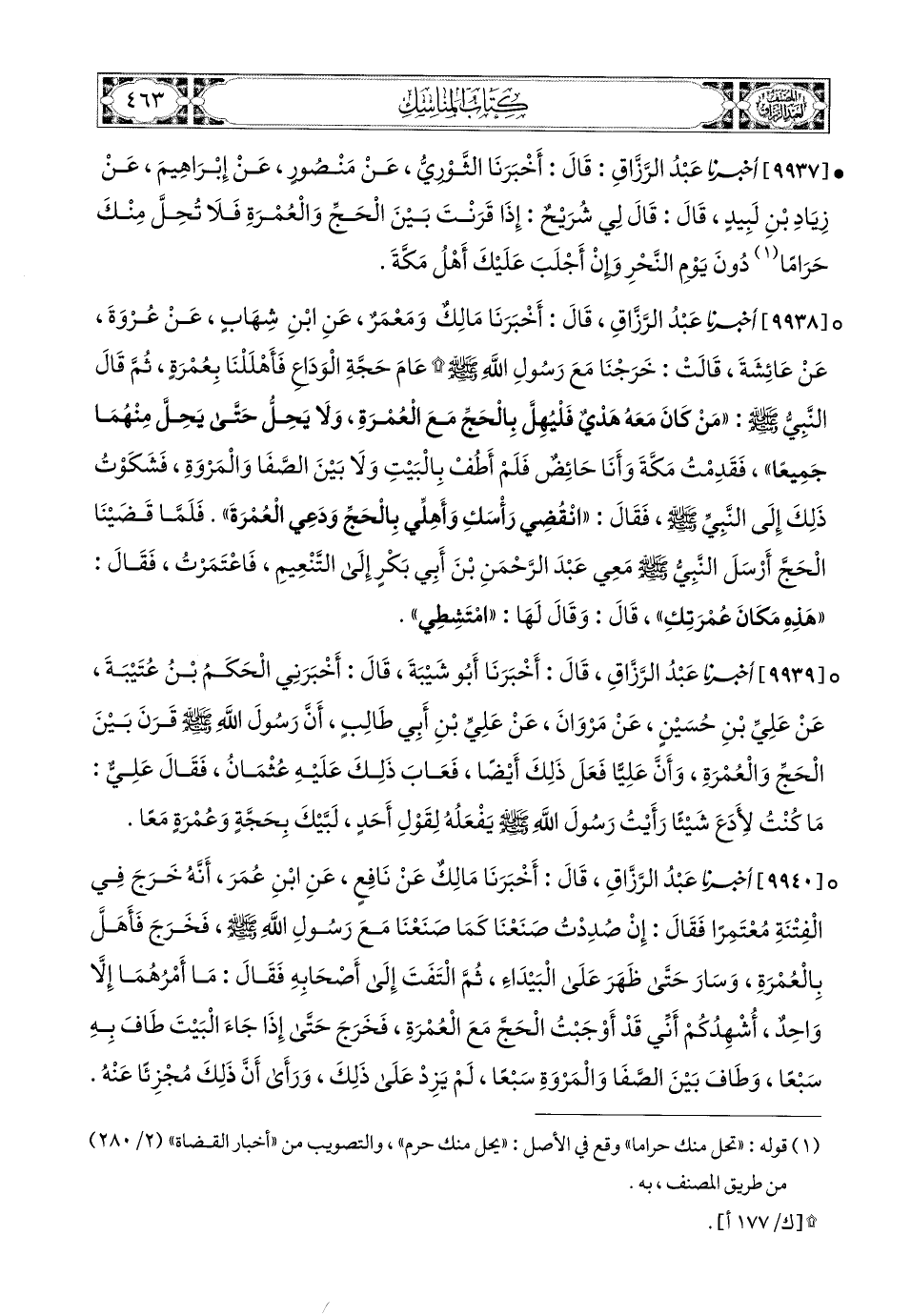 9938- أخبرنا عبد الرزاق، قَالَ: أَخْبَرَنَا مَالِكٌ، وَمَعْمَرٌ، عَنِ ابْنِ شِهَابٍ، عَنْ عُرْوَةَ، عَنْ عَائِشَةَ، قَالَتْ: خَرَجْنَا مَعَ رَسُولِ اللهِ صَلَّى اللهُ عَلَيْهِ وَسَلَّمَ عَامَ حَجَّةِ الْوَدَاعِ، فَأَهْلَلْنَا بِعُمْرَةٍ، ثُمَّ قَالَ النَّبِيُّ صَلَّى اللهُ عَلَيْهِ وَسَلَّمَ: مَنْ كَانَ مَعَهُ هَدْيٌ فليهل بالحج مع العمرة، ولا يحل، حَتَّى يحل منهما جميعًا، فقدمت مكة وأنا حائض، فلم أطف بالبيت، ولا بَيْنَ الصَّفَا وَالْمَرْوَةِ، فشكوت ذلك إِلَى النَّبِيِّ صَلَّى اللهُ عَلَيْهِ وَسَلَّمَ، فَقَالَ: انقضي رأسك، وأهلي بالحج، ودعي العمرة، فَلَمَّا قضينا الحج، أرسل النبي صَلَّى اللهُ عَلَيْهِ وَسَلَّمَ معي عبد الرحمن بن أبي بكر إِلَى التنعيم، فاعتمرت، فَقَالَ: هذه مكان عمرتك، قَالَ: وَقَالَ لَهَا: امتشطي.