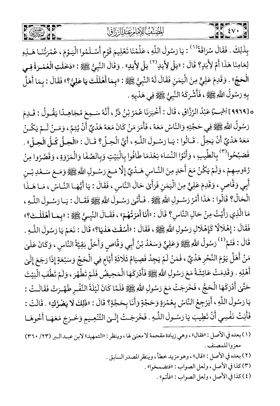 9969- أخبرنا عبد الرزاق، قَالَ: أَخْبَرَنَا عُمَرُ بْنُ ذَرٍّ، أَنَّهُ سَمِعَ مُجَاهِدًا يَقُولُ: قدم رسول الله صَلَّى اللهُ عَلَيْهِ وَسَلَّمَ فِي حجته، والناس معه، فأمر مَنْ كَانَ مَعَهُ هَدْيٌ أن يتم، ومن لم يكن مَعَهُ هَدْيٌ أن يحل، قَالُوا: يَا رَسُولَ اللهِ، أي الحل؟ قَالَ: الحل كل الحل، فصبحوا بالطيب، وأتوا النساء بعدما طافوا بالبيت، وَبِالصَّفَا وَالْمَرْوَةِ، وقصروا من رءوسهم، ولم يكن مع أحد من الناس هدي، إلا مع رَسُولِ اللهِ صَلَّى اللهُ عَلَيْهِ وَسَلَّمَ، ومع سعد بن أبي وقاص، وقدم علي من اليمن، فرأى حال الناس، فَقَالَ: يَا أَيُّهَا النَّاسُ، ما هَذَا الحال؟ قَالُوا: هَذَا أمر رَسُولِ اللهِ صَلَّى اللهُ عَلَيْهِ وَسَلَّمَ، فأتى رسول الله صَلَّى اللهُ عَلَيْهِ وَسَلَّمَ فَقَالَ: يَا رَسُولَ اللهِ، ما الذي رَأَيْتُ من حال الناس؟ قَالَ: أنا أمرتهم، فَقَالَ النبي صَلَّى اللهُ عَلَيْهِ وَسَلَّمَ: بِمَا أهللت؟ فَقَالَ: إهلالًا كإهلال رَسُولِ اللهِ صَلَّى اللهُ عَلَيْهِ وَسَلَّمَ، فَقَالَ: أسقت هديا؟ قَالَ: نَعَمْ يَا رَسُولَ اللهِ، قَالَ: فتم رسول الله صَلَّى اللهُ عَلَيْهِ وَسَلَّمَ وعلي، وسعد بن أبي وقاص، وأحل بقية الناس، وَكَانَ على من أهل يوم النحر هدي، فمن لم يجد فصيام ثلاثة أيام فِي الحج، وسبعة إِذَا رَجَعَ إِلَى أهله، وقدمت عائشة مع رَسُولِ اللهِ صَلَّى اللهُ عَلَيْهِ وَسَلَّمَ، فأدركها المحيض، فلم تطهر، ولم تطف البيت، حَتَّى أدركها الحج، فَخَرَجْتُ مع رَسُولِ اللهِ صَلَّى اللهُ عَلَيْهِ وَسَلَّمَ، فَلَمَّا كَانَ ليلة النفر طهرت، فَقَالَتْ: يَا رَسُولَ اللهِ، أيرجع الناس بعمرة وحجة، وأنا بحجة؟ قَالَ: ذلك لا يضرك، قَالَتْ: فأبت نفسي أن تطيب يَا رَسُولَ اللهِ، فَخَرَجْتُ إِلَى التنعيم، وخرج معها أخوها ابن أبي بكر، وأناخ رسول الله صَلَّى اللهُ عَلَيْهِ وَسَلَّمَ بالبطحاء، ثُمَّ كره أن يقتدي الناس بإناخته، فبعث حَتَّى أناخ على ظهر العقبة، أو من ورائها ينتظرها، ونادى رسول الله صَلَّى اللهُ عَلَيْهِ وَسَلَّمَ: إِنَّ الْعُمْرَةَ قد دخلت فِي الحج إِلَى يوم القيامة، مرتين، قلت لمجاهد: أكانوا فرضوا الحج، أم أمرهم أن يهلوا، أم انتظروا ما يؤمروا به؟ قَالَ: بل أهلوا بإهلال النبي صَلَّى اللهُ عَلَيْهِ وَسَلَّمَ، واتنظروا ما يؤمروا به، فأمر النبي صَلَّى اللهُ عَلَيْهِ وَسَلَّمَ مَنْ كَانَ مَعَهُ هَدْيٌ أن يتم، ومن لم يكن مَعَهُ هَدْيٌ أن يحل.