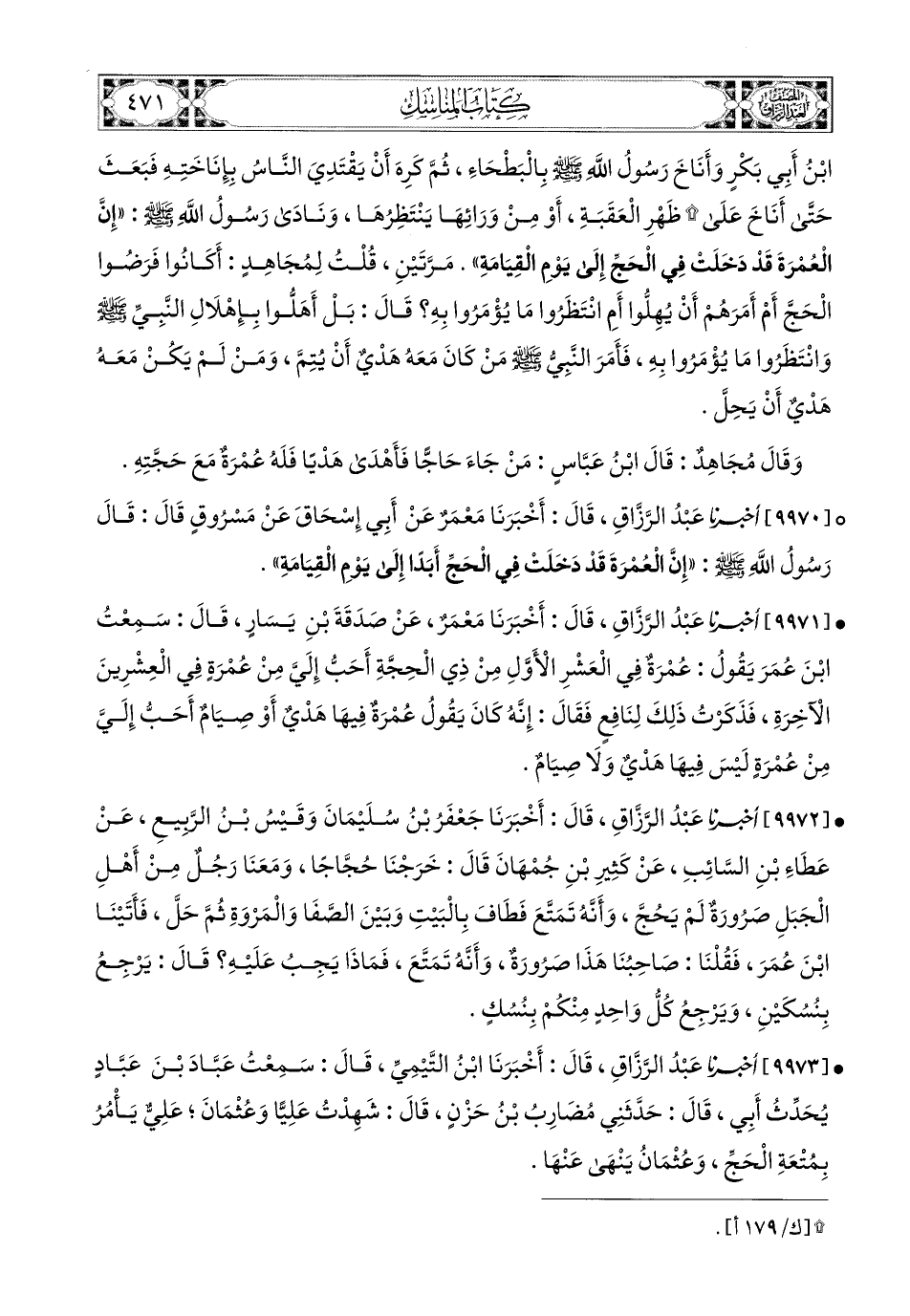 9970- أخبرنا عبد الرزاق، قَالَ: أَخْبَرَنَا مَعْمَرٌ، عَنْ أَبِي إِسْحَاقَ، عَنْ مَسْرُوقٍ، قَالَ: قَالَ رَسُولُ اللهِ صَلَّى اللهُ عَلَيْهِ وَسَلَّمَ: إِنَّ الْعُمْرَةَ قد دخلت فِي الحج أبدًا إِلَى يوم القيامة.