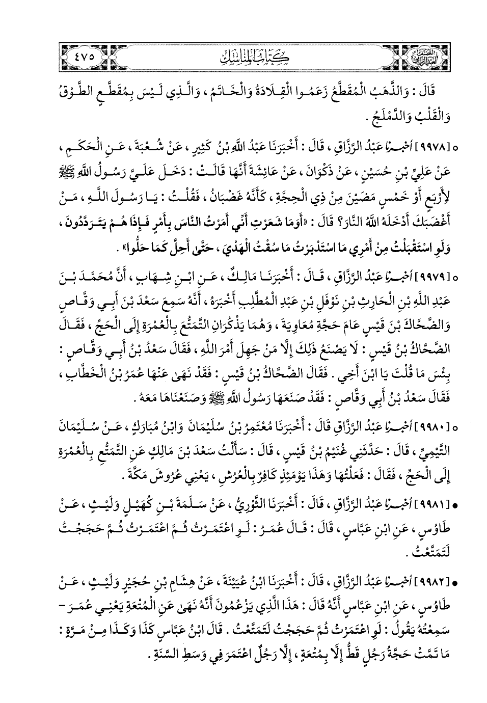 9979- أخبرنا عبد الرزاق، قَالَ: أَخْبَرَنَا مَالِكٌ، عَنِ ابْنِ شِهَابٍ، أَنَّ مُحَمَّدَ بْنَ عَبْدِ اللهِ بْنِ الْحَارِثِ بْنِ نَوْفَلِ بْنِ عَبْدِ الْمُطَّلِبِ أَخْبَرَهُ، أَنَّهُ سَمِعَ سَعْدَ بْنَ أَبِي وَقَّاصٍ، وَالضَّحَّاكَ بْنَ قَيْسٍ عَامَ حَجَّةِ مُعَاوِيَةَ، وهما يذكران التمتع بِالْعُمْرَةِ إِلَى الْحَجِّ، فَقَالَ الضَّحَّاكُ بْنُ قَيْسٍ: لا يصنع ذلك إلا من جهل أمر الله، فَقَالَ سَعْدُ بْنُ أَبِي وَقَّاصٍ: بئس ما قلت يا ابن أخي، فَقَالَ الضَّحَّاكُ بْنُ قَيْسٍ: فقد نهى عنها عمر بن الخطاب، فَقَالَ سَعْدُ بْنُ أَبِي وَقَّاصٍ: فقد صنعها رسول الله صَلَّى اللهُ عَلَيْهِ وَسَلَّمَ وصنعناها معه.